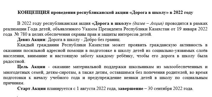 2022 жылы «Мектепке жол» Республикалық акциясын өткізудің Тұжырымдамасы КОНЦЕПЦИЯ проведения республиканской акции «Дорога в школу» в 2022 году