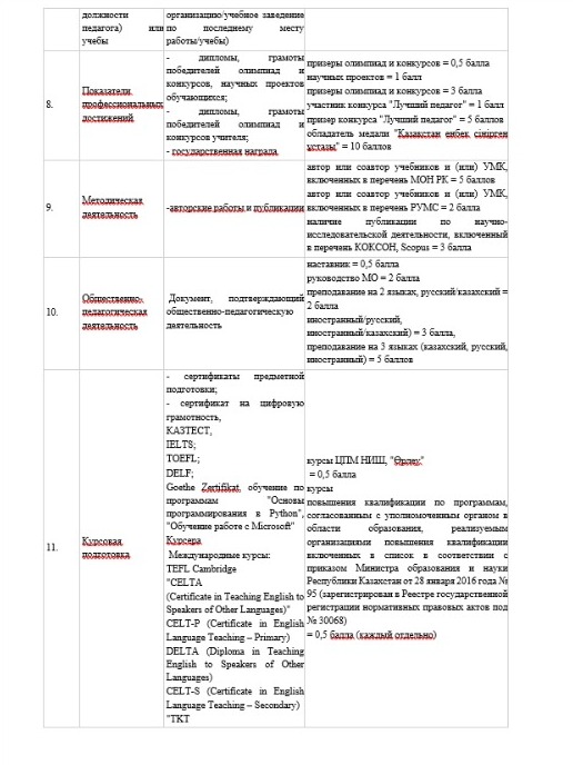 обладатель медали "Қазақстан еңбек сіңірген ұстазы" = 10 баллов