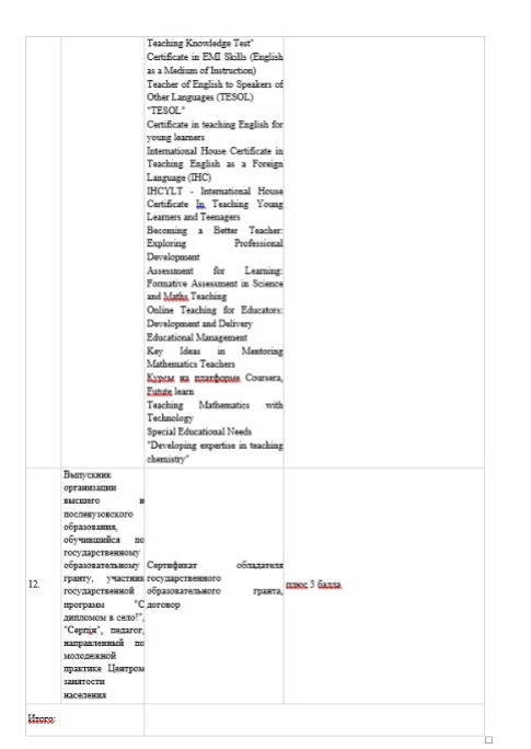 12. Выпускник организации высшего и послевузовского образования, обучившийся по государственному образовательному гранту, участник государственной программ "С дипломом в село!", "Серпiн", педагог, направленный по молодежной практике Центром занятости населения Сертификат обладателя государственного образовательного гранта, договор плюс 3 балла