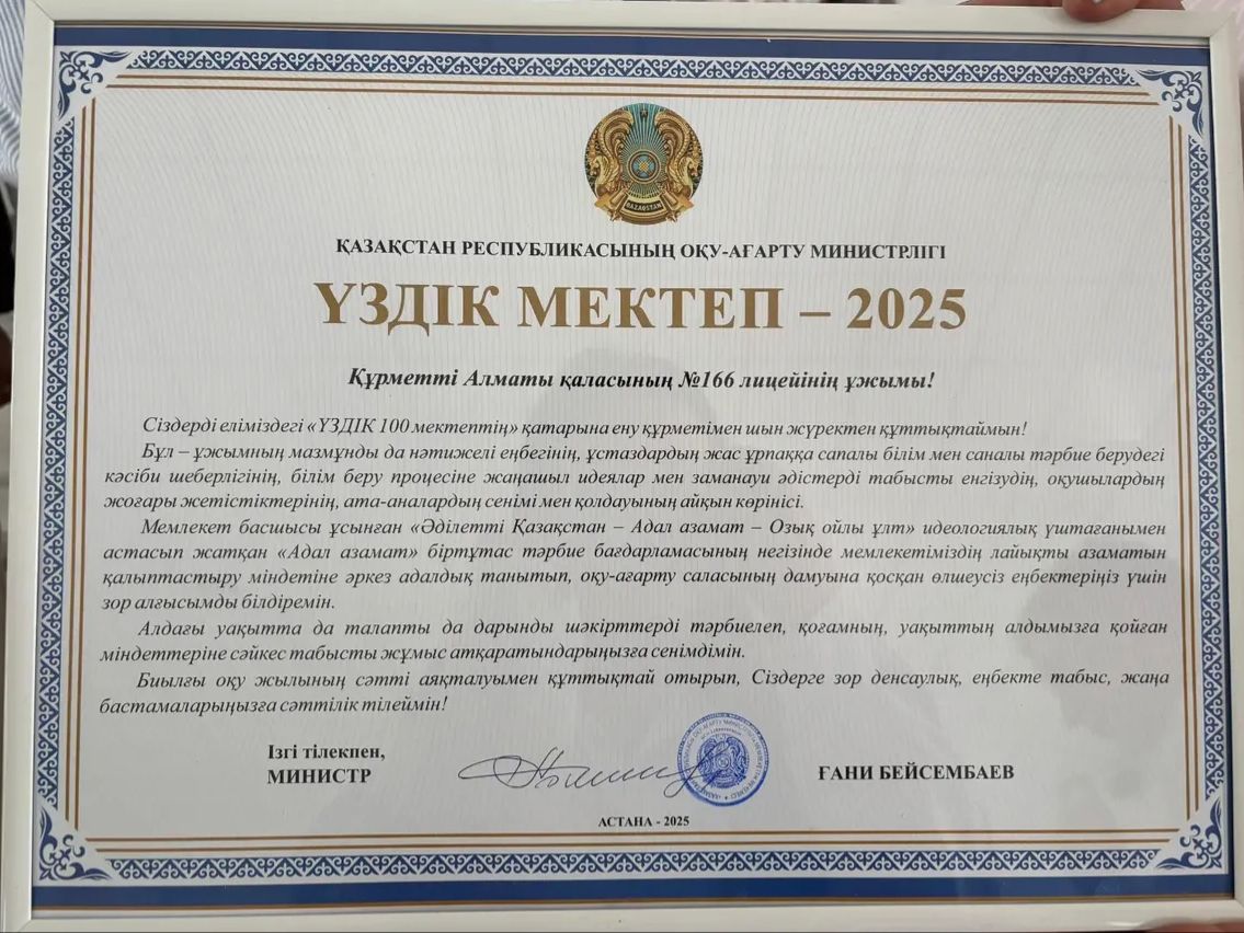 Мақтанышпен хабарлаймыз! «№166 лицей» КММ 2025 жылғы Қазақстанның ең үздік 100 мектебінің қатарына енді!