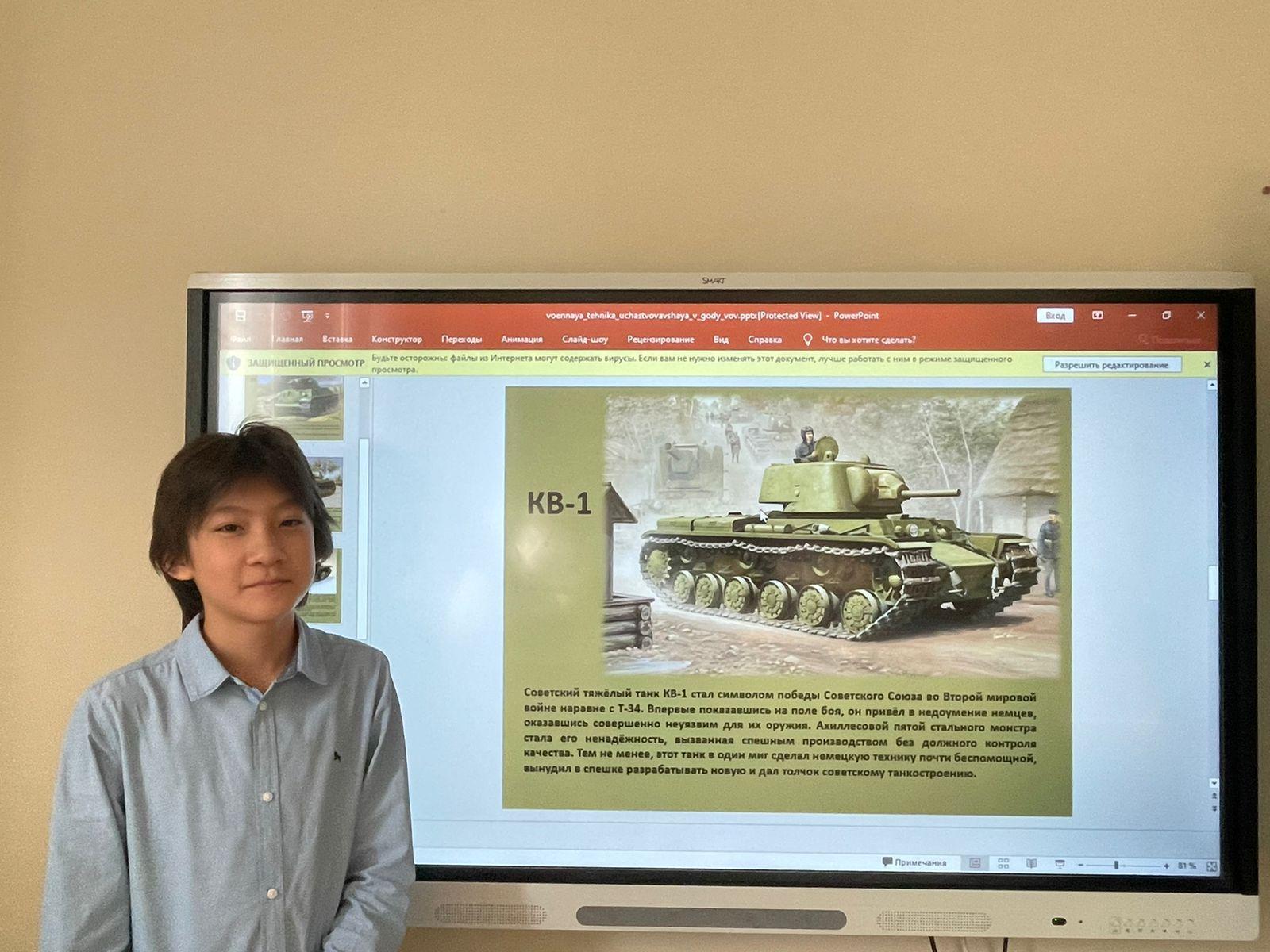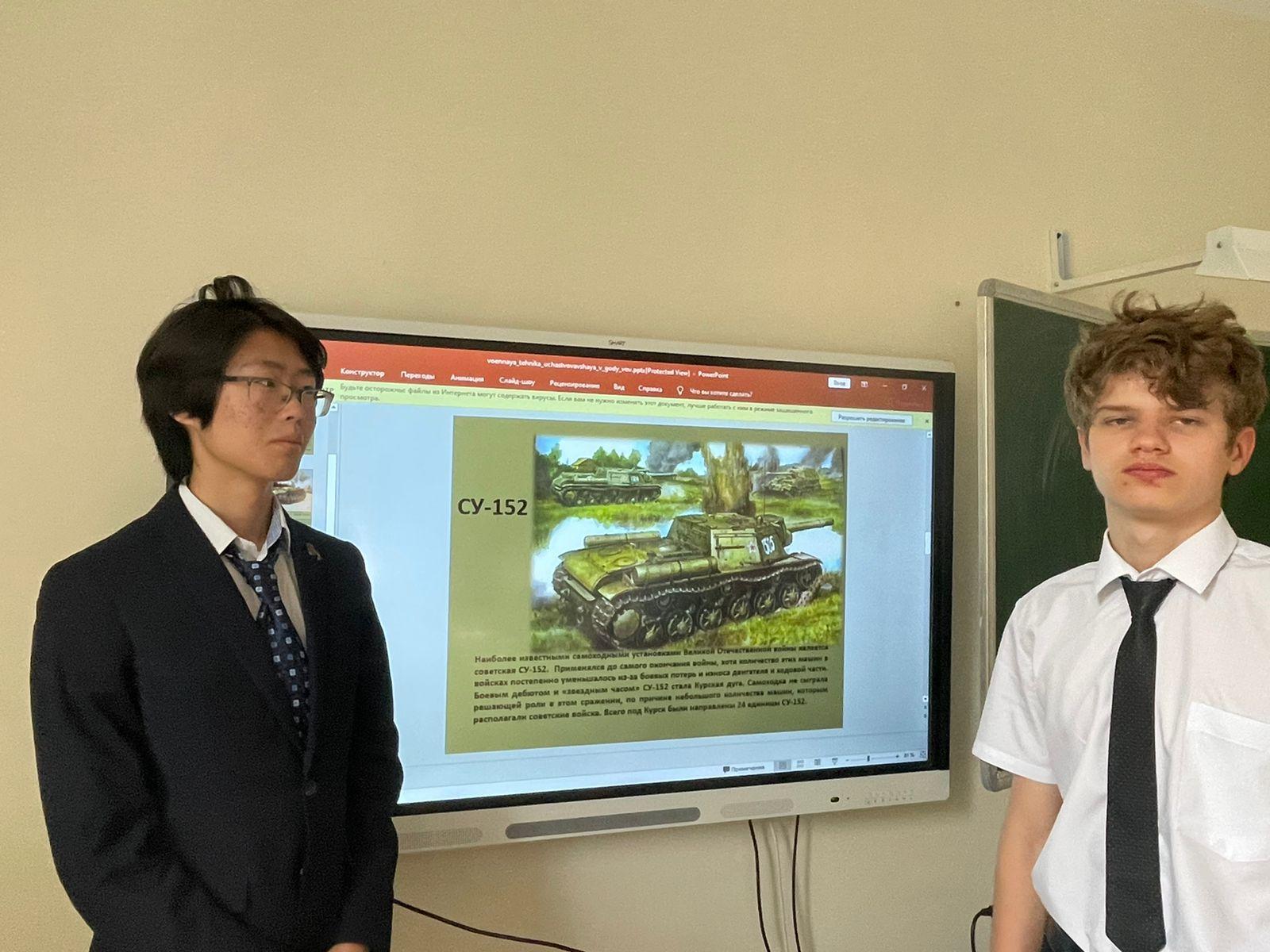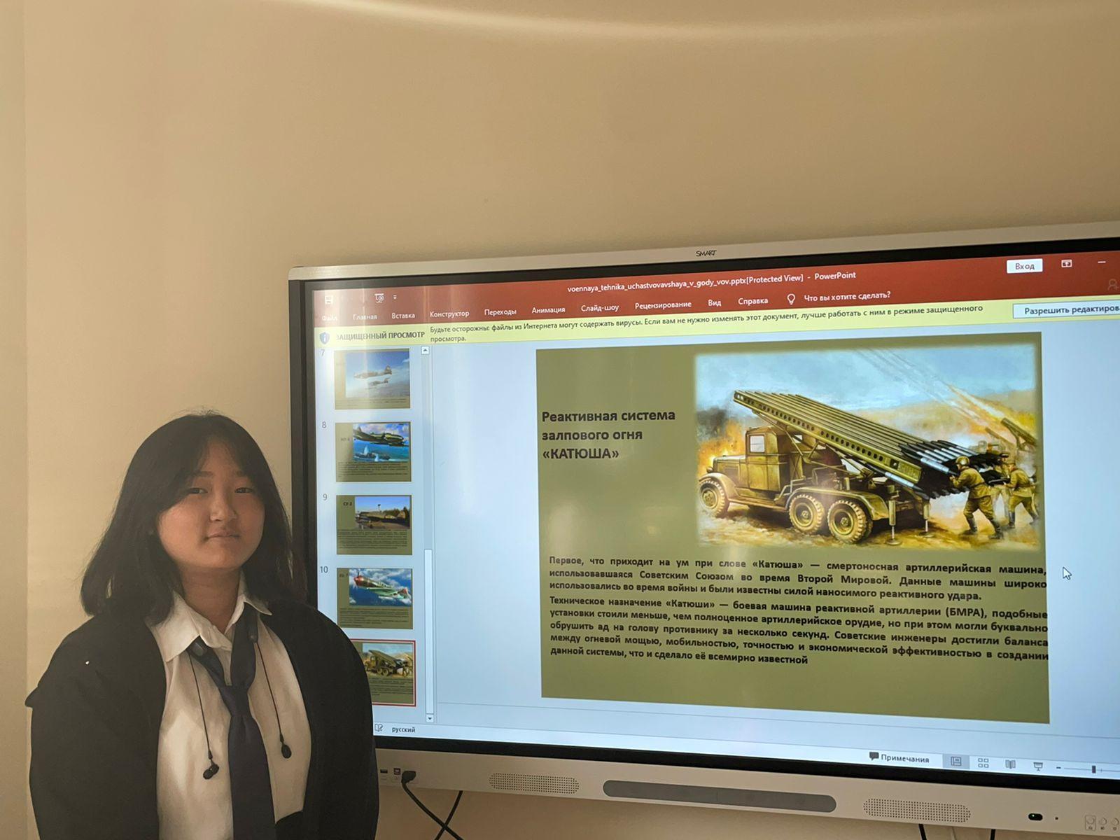 На классном часе "Боевое оружие Победы" ученики 8 «А» класса КГУ «Лицей № 166» расширили свои знания о боевой технике Второй мировой войны. Это узнаваемые символы - реактивная установка "Катюша ", танк Т-34, автомат Калашникова, истребители, штурмовики. Именно эта боевая техника помогла одержать победу.