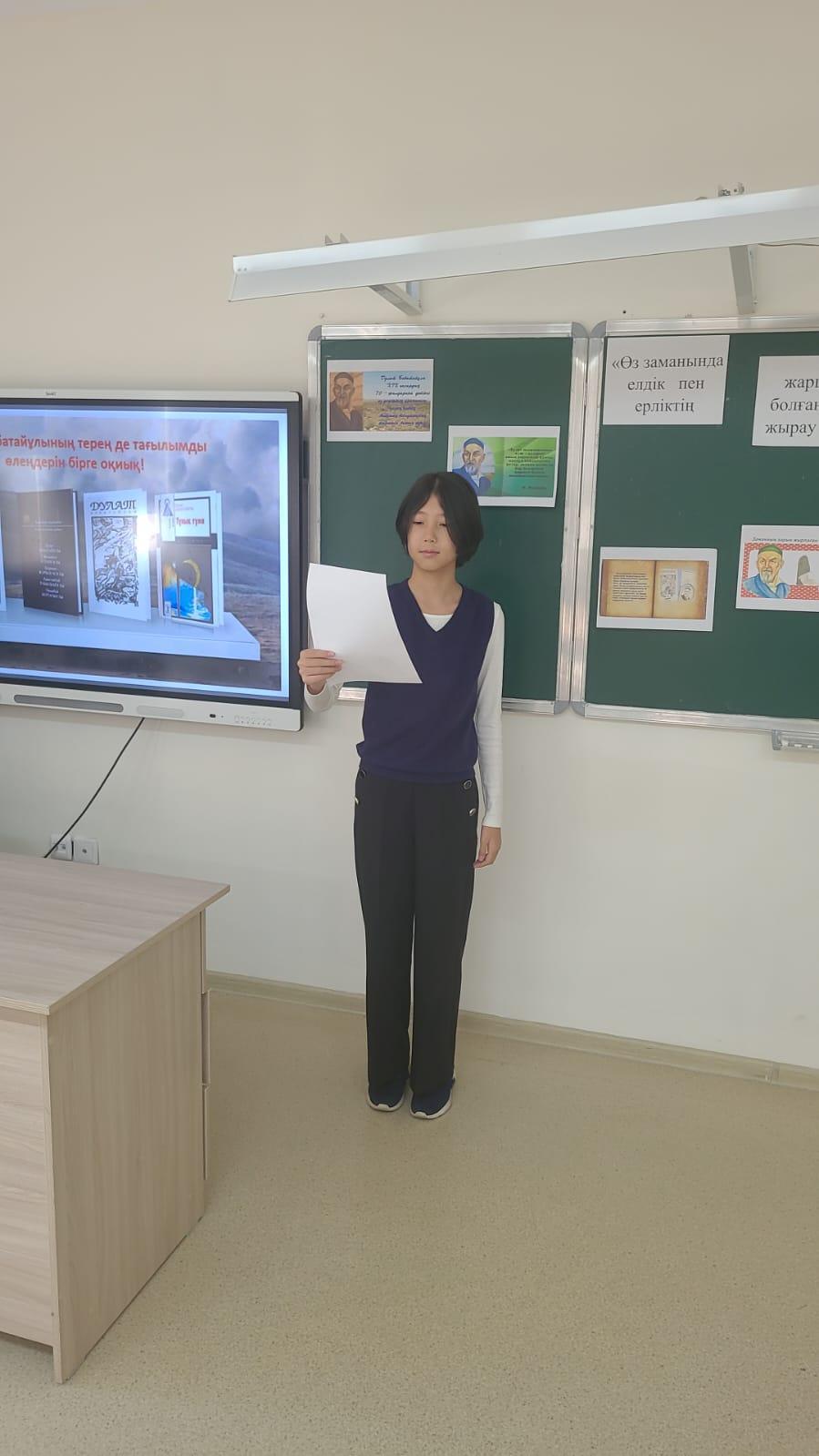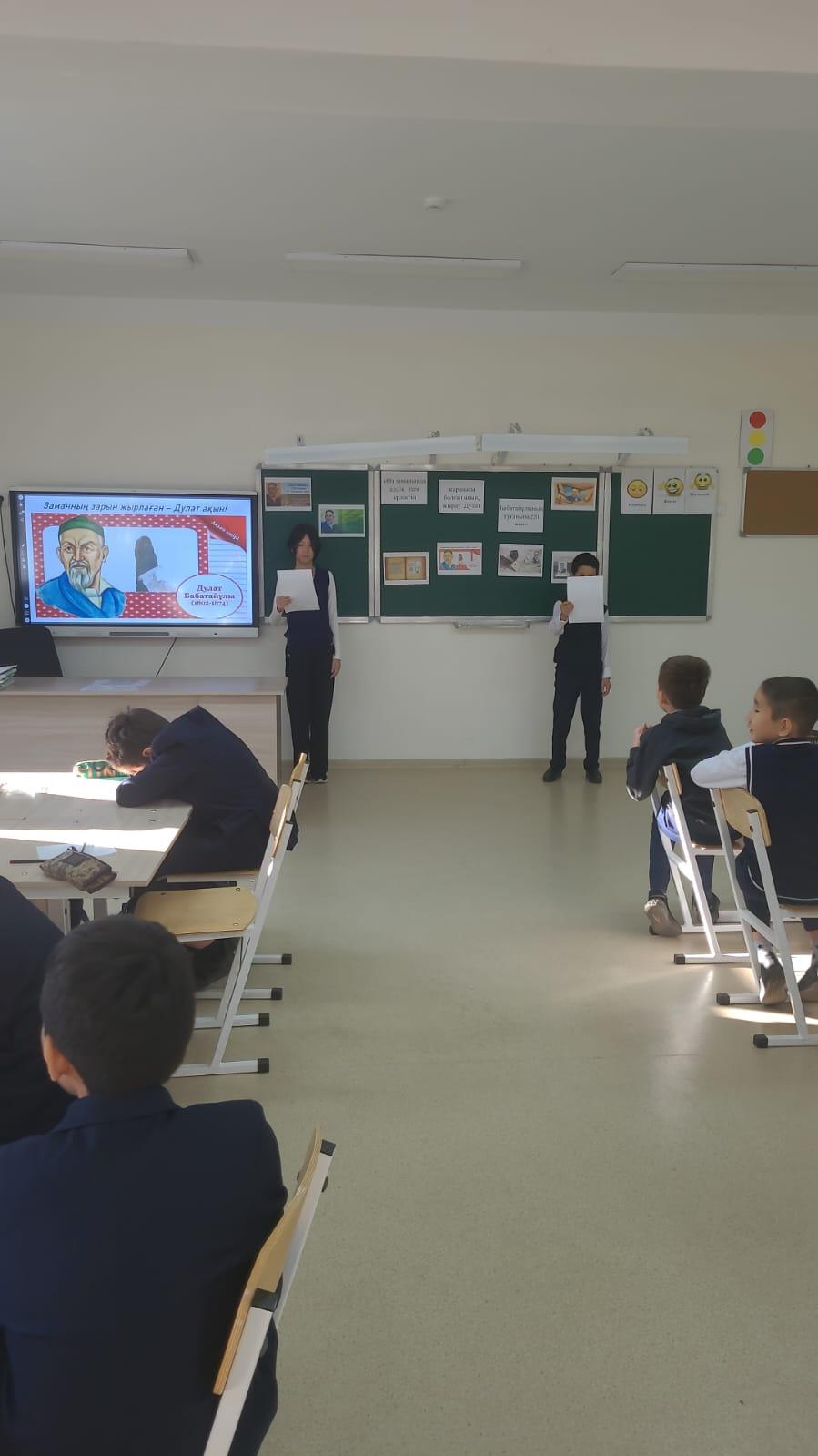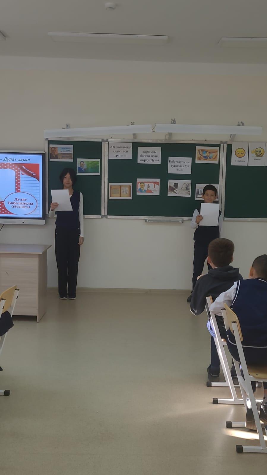 «№ 166 лицей» КММ-сінде 5 «Б» сынып оқушыларына арналған "Өз заманында елдік пен ерліктің жаршысы болған ақын, жырау Дулат Бабатайұлының туғанына 220 жыл" атты тәрбие сағаты өтті.