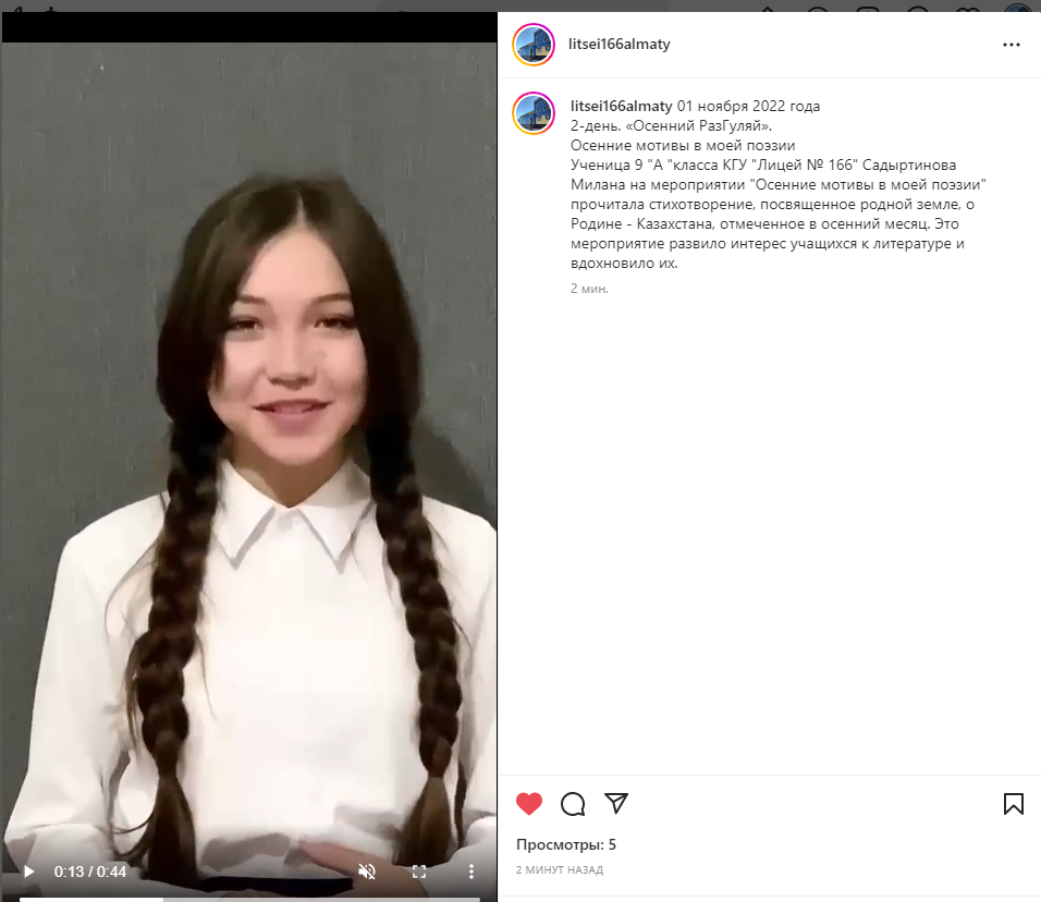 Ученица 9 "А "класса КГУ "Лицей № 166" Садыртинова Милана на мероприятии "Осенние мотивы в моей поэзии" прочитала стихотворение, посвященное родной земле, о Родине - Казахстана, отмеченное в осенний месяц. Это мероприятие развило интерес учащихся к литературе и вдохновило их.