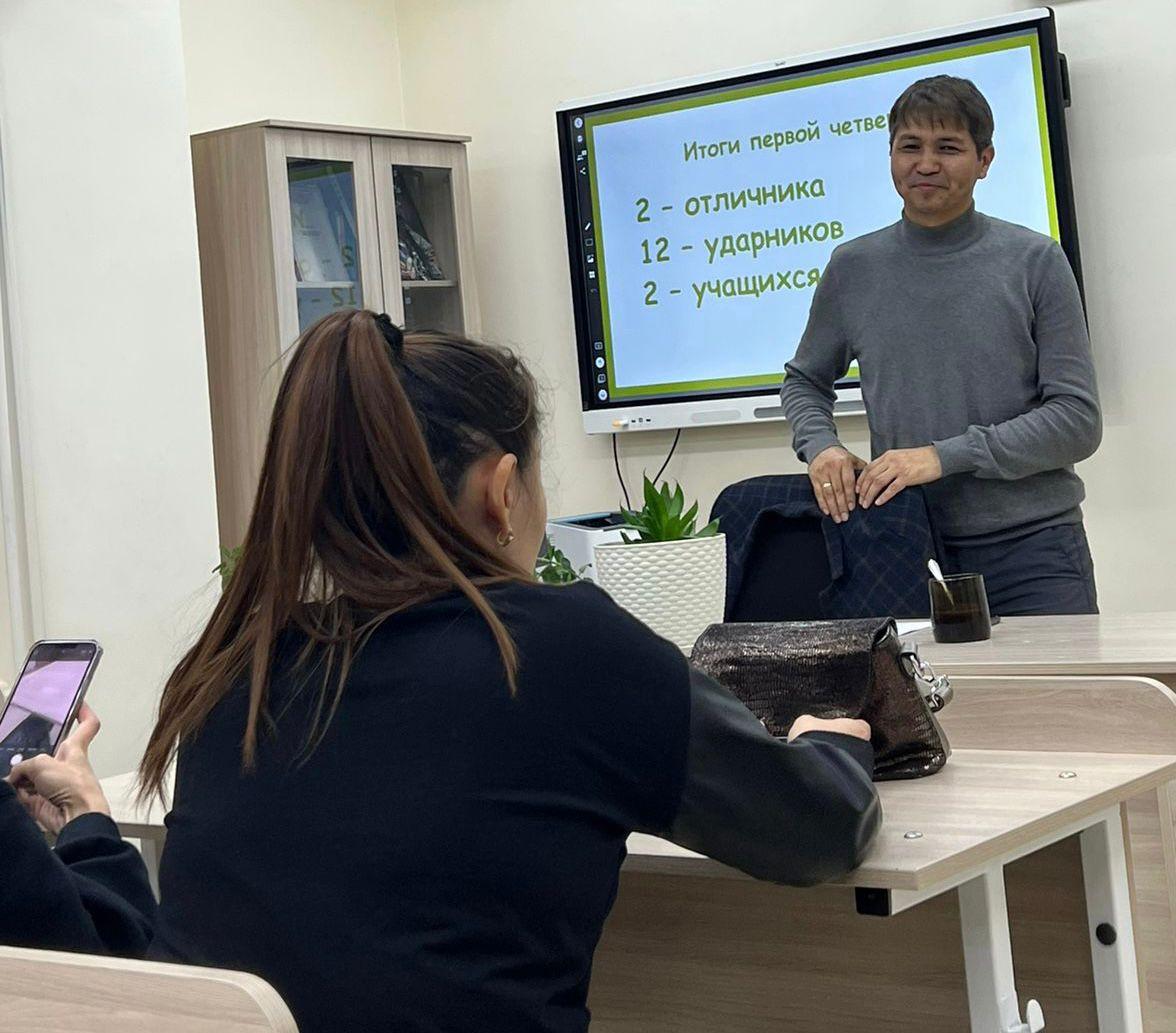 Родители сосредоточенно, с большим вниманием слушали выступление классного руководителя Туркменбаева А.Р. Он рассказал о проделанной работе, об успехах 1 четверти, о задачах на 2 четверть 2022-2023 учебного года.