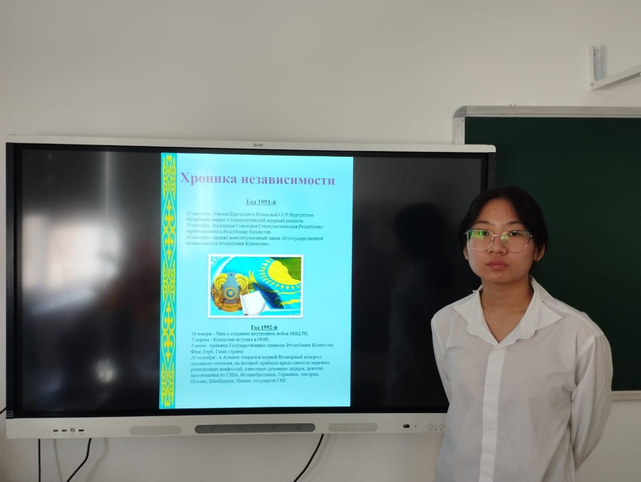 В 9А классе классный час «Цвети, Казахстан, родная земля!» провели в форме устного журнала. Накануне дети ответили на такие вопросы анкеты: «Как вы считаете, должны ли быть развиты чувства патриотизма и гражданственности у современного молодого человека? Какими качествами должен обладать истинный патриот? Что вы делаете для развития своей страны? С чем ассоциируются у вас слова родина, гражданственность?» Результатам этого анкетирования посвящена первая страница. Вторая страница «Пою мое Отечество, республику мою!» - Садыртинова Милана прочитала стихотворение В.Каримова «Казахстан – страна родная». Третья страница «Хроника Независимости» охватила панораму прошлого, настоящего и будущего нашей Родины. В завершение классного часа прозвучали такие строки: