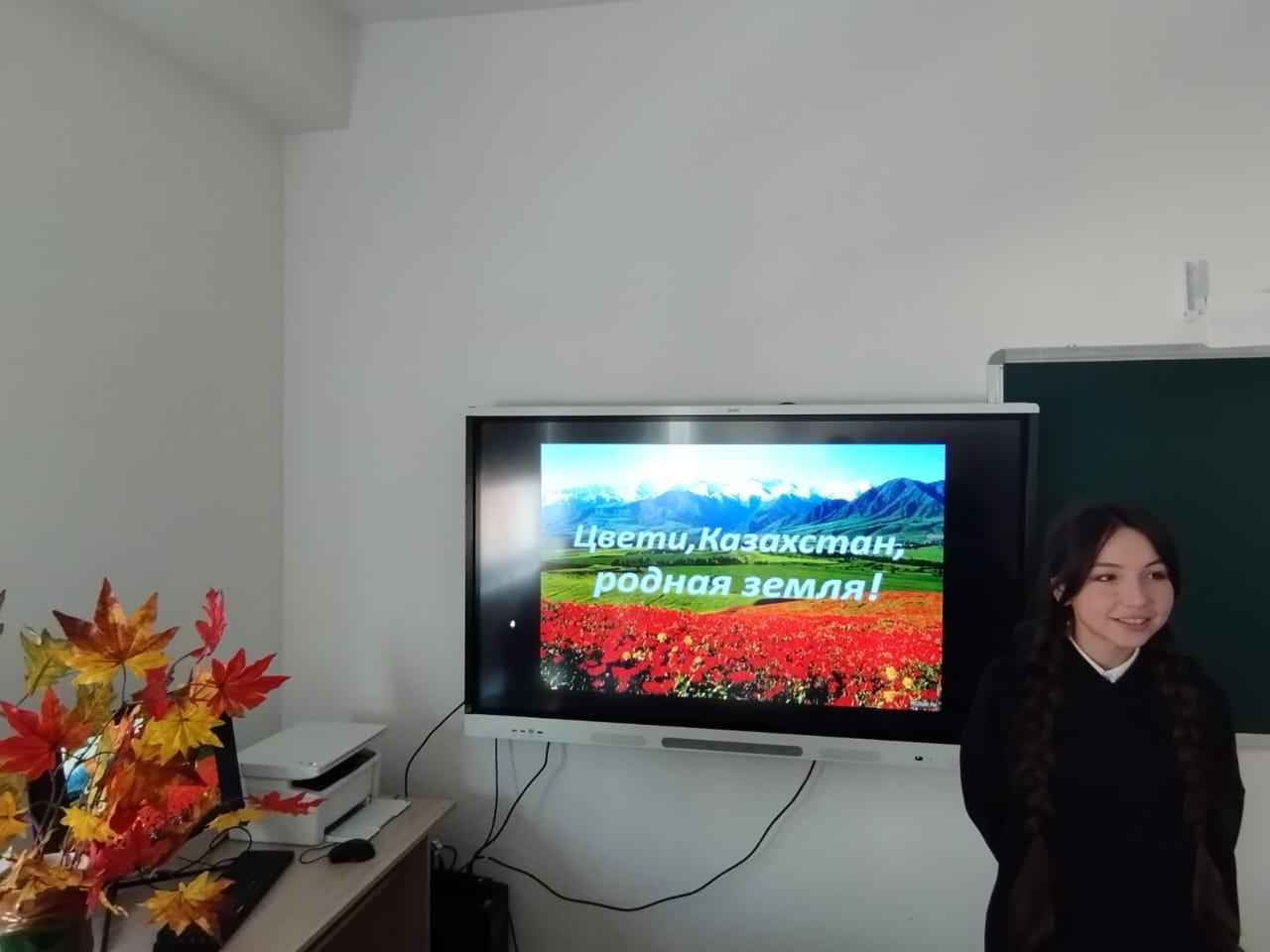 9А сыныбында «Гүлдей бер, Қазақстан, туған жер!» атты сынып сағаты өтті. ауызша журнал түрінде жүргізіледі. Бір күн бұрын балалар сауалнаманың келесі сұрақтарына жауап берді: «Қазіргі жастың бойында патриоттық, азаматтық сезімдер қалыптасуы керек деп ойлайсыз ба? Нағыз патриоттың бойында қандай қасиеттер болуы керек? Елді дамыту үшін не істеп жатырсыз? Отан, азаматтық деген сөздерді немен байланыстырасың? Бірінші бет осы сауалнама нәтижелеріне арналған. Екінші бет «Жырлаймын Отанымды, Республикамды!» - Садыртинова Милана В.Каримовтың «Қазақстан – туған ел» өлеңін оқыды. «Тәуелсіздік шежіресінің» үшінші бетінде Отанымыздың өткені мен бүгіні мен болашағының панорамасы қамтылды. Сынып сағатының соңында келесі жолдар айтылды: