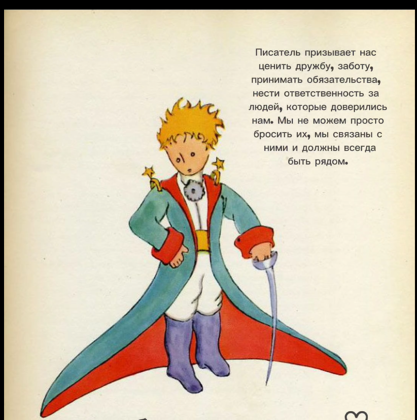 Книга Антуана де Сент-Экзюпери «Маленький принц» одна из таких.Ее автор, французский летчик и писатель, взрослый, так и оставшийся в душе ребенком. Книга «Маленький принц» рассказывает о необыкновенной встрече пилота (из-за неполадок в моторе летчику пришлось посадить самолет в пустыне) с Маленьким принцем, гостем с другой планеты.Главный герой в детстве нарисовал необычную картинку – на ней был изображён удав, проглотивший слона. Но все взрослые, которым он её показывал, видели в изображении только скучную шляпу. Рассказчик вырос, стал лётчиком, и однажды его самолёт сломался над пустыне.Маленький принц оказался пришельцем с другой планеты, крошечного астероида, который и в мощный телескоп-то не сразу разглядишь. Его дому угрожала опасность – на астероиде могли вырасти баобабы, которые своими корнями грозили разорвать его в лочья.А ещё на планете Маленького Принца выросла гордая и капризная Роза. Принц полюбил её, но характер у красавицы оказался таким трудным, что в какой-то момент мальчик отправился в путешествие на другие планеты.Где он только не побывал и кого только не встретил – и Короля, который отдавал бесполезные приказы, и Делового человека, который был занят только тем, что всё время что-то считал, и Пьяницу, который пил, чтобы не чувствовать стыда от собственного пьянства.В конце концов Маленький принц оказался на земле, в пустыне, где и встретил Лётчика, а также Лиса. Лис научил принца, что мы в ответе за тех, кого приручили. Принц понял, что ему нужно возвращаться к своей Розе – ведь он приручил её, а значит, должен окружить своей любовью. Писатель призывает нас ценить дружбу, заботу, принимать обязательства, нести ответственность за людей, которые доверились нам. Мы не можем просто бросить их, мы связаны с ними и должны всегда быть рядом.