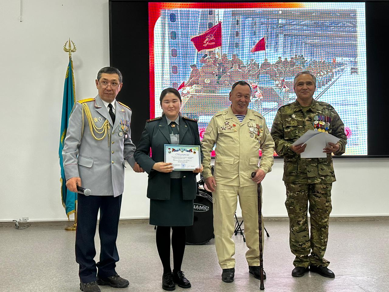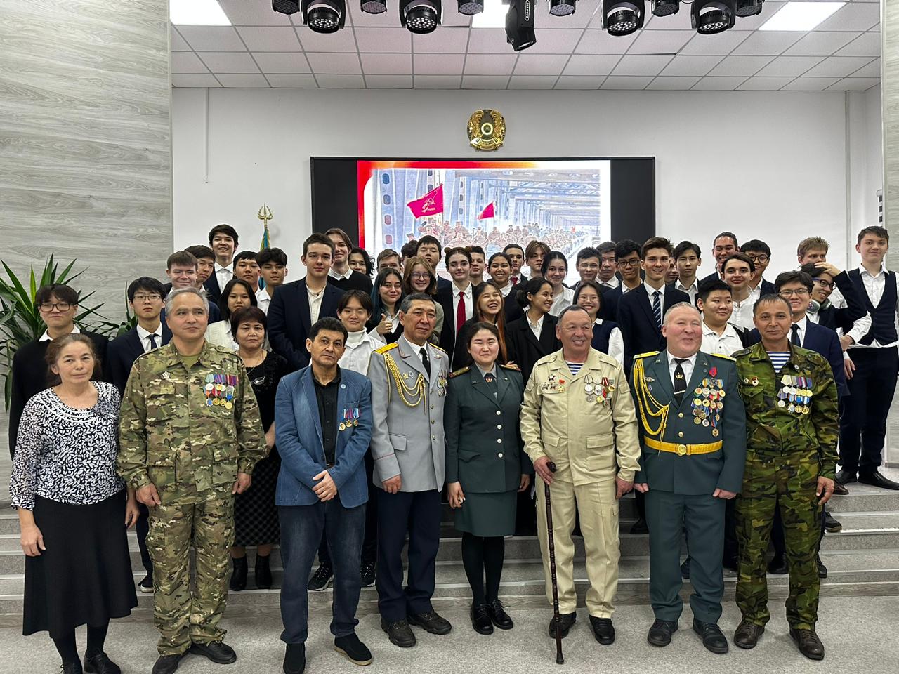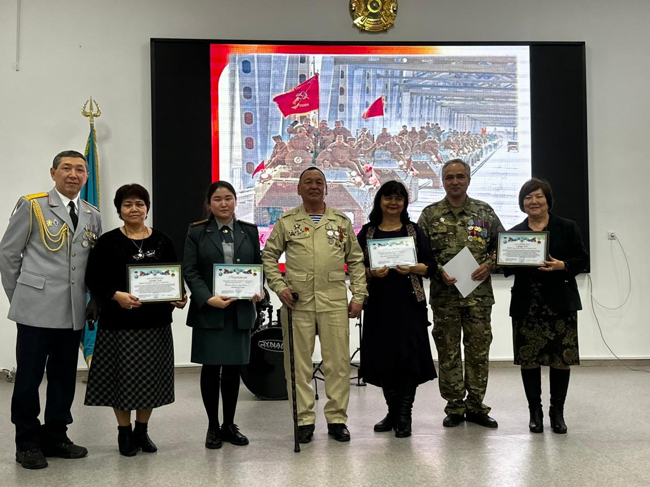 Перед учащимися выступили ветераны воины – афганской войны Кыргызбаев Болат, ветераны боевых действий, принимавшие участие в урегулирование межэтнического конфликта в Нагорном Карабахе Джалилов Фурхат Пархатович, Елеусизов Адылбек Мугалаевич, Талипов Таир Азатович, Азамов Фуркат Ахматходжаевич, ветеран вооруженных конфликтов в Ираке Канатов Марат.