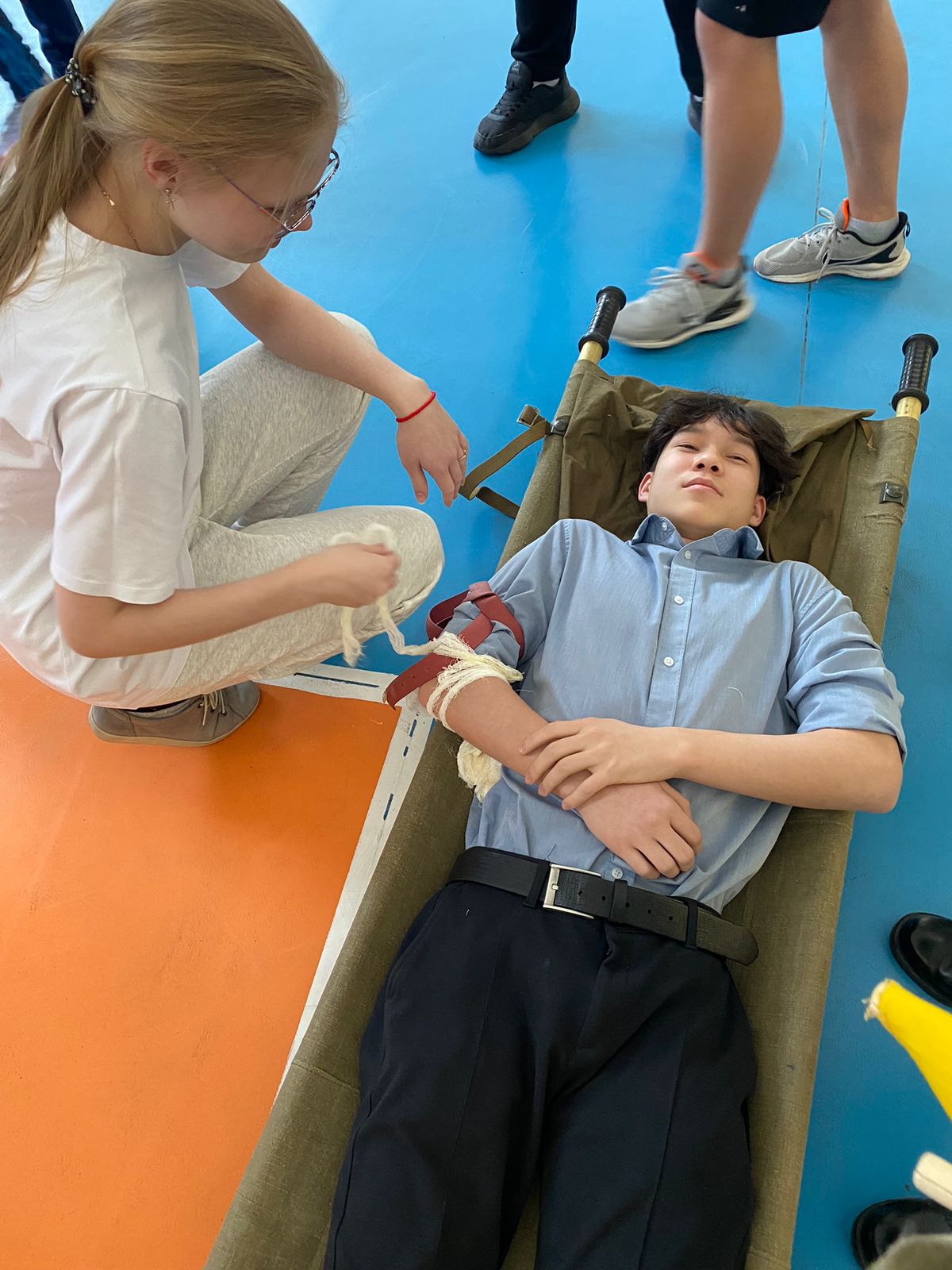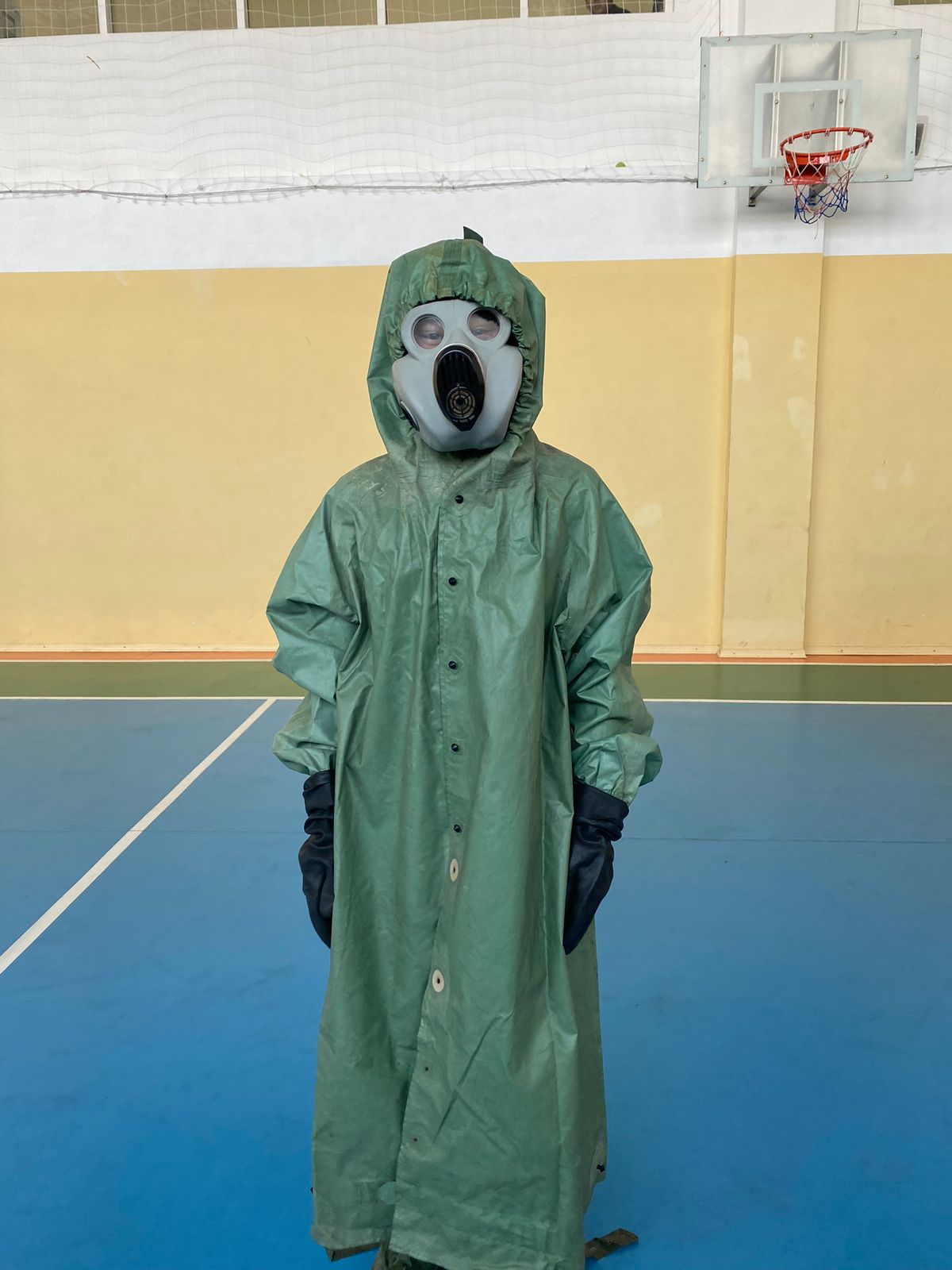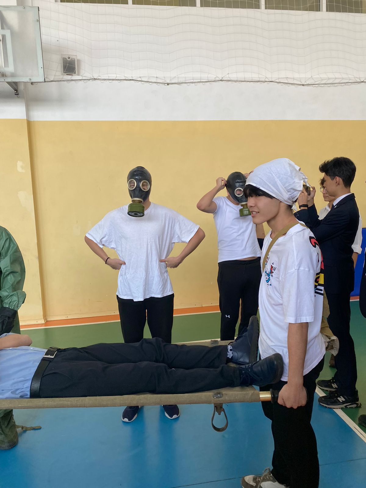Ученики поделились по группам и демонстрировали основные защитные обмундирования. На скорость одевали противогаз, забинтовали пострадавшего, и полный защитный костюм солдата; Оказывали первую помощь с соответствием техники безопасности.