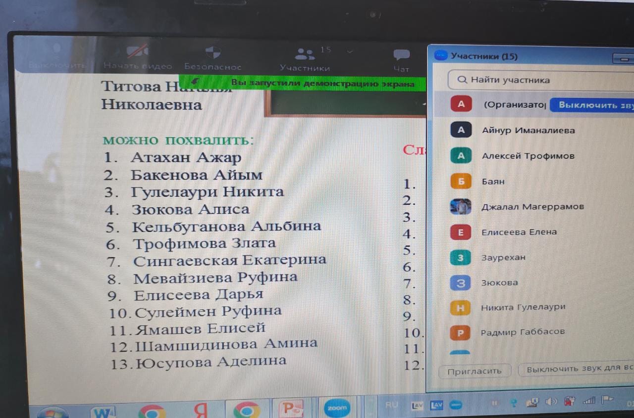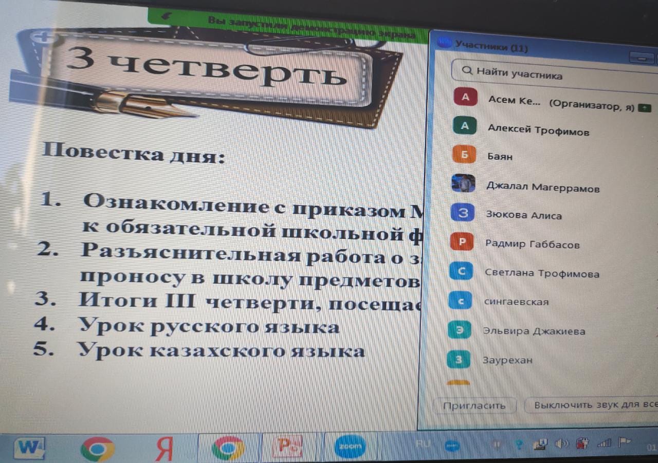 Ата-аналар бұйрықпен және түсіндірме ақпаратпен және 3 тоқсанның қорытындысымен таныстырылды. Орыс тілі, қазақ тілі мұғалімдері сыныптың үлгерімі, сондай-ақ үлгерімі төмен оқушылар туралы айтып өтті.