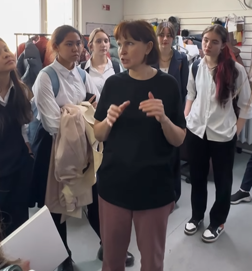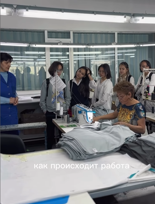 Кіре берісте оқушыларға тігін цехтарының меңгерушісі Тәжібаева Шолпан Қылышбекқызы мен кәсіпорынның өндірістік оқыту шебері Галактионова Мария Алексеевна жылы лебізімен қарсы алды. Олар киім өндірісінің барлық цехтарын тамашалап көрді! Экскурсияның басынан бастап қыздар бөлшектерді таңбалау олардың барлық өлшемінде жүргізілетін шеберхананы аралады. Қыздарды плоттердің жұмысы қызықтырды - бөлшектерді кесуге арналған аппарат! Әрі қарай, олар өнімді құрастыру кезінде шатастырмас үшін барлық бөліктердің нөмірленуі қалай жүріп жатқанын қарастырды.