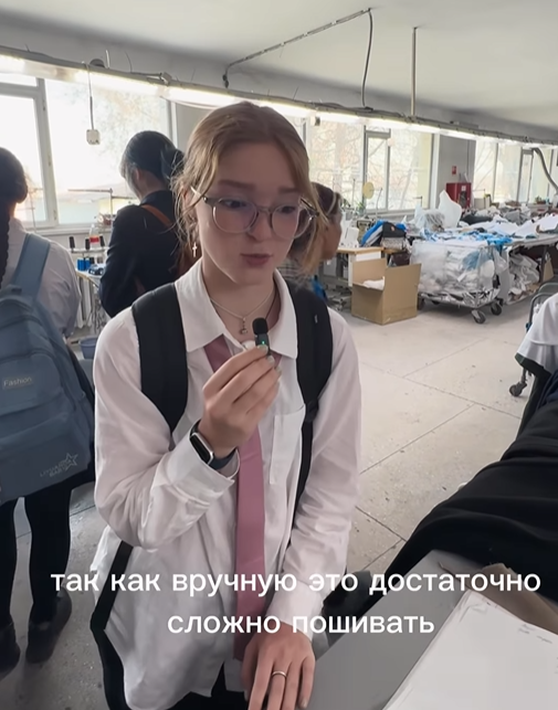 Надолго девушек задержала машина для резки ткани. Они наблюдали, как она движется и разрезает ткань на части. Затем их привели в пошивочный цех, где из деталей сшивались готовые изделия. Опытные швеи показали, как на одежде появляются клёпки и, тем самым, скрепляют части изделия между собой.