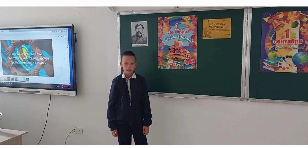 Канатов Арлан, ученик 6 «Г» класса прочёл стихотворение ученого-просветителя казахского народа Ыбырая Алтынсарина «Кел, балалар, оқылық!».