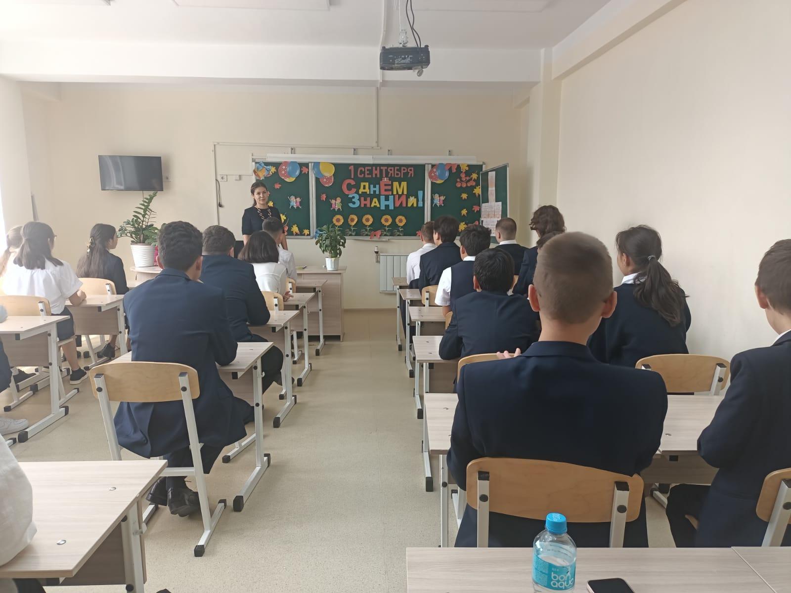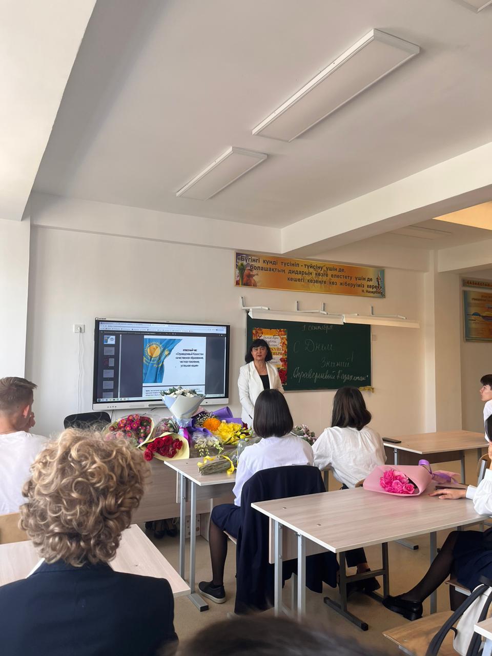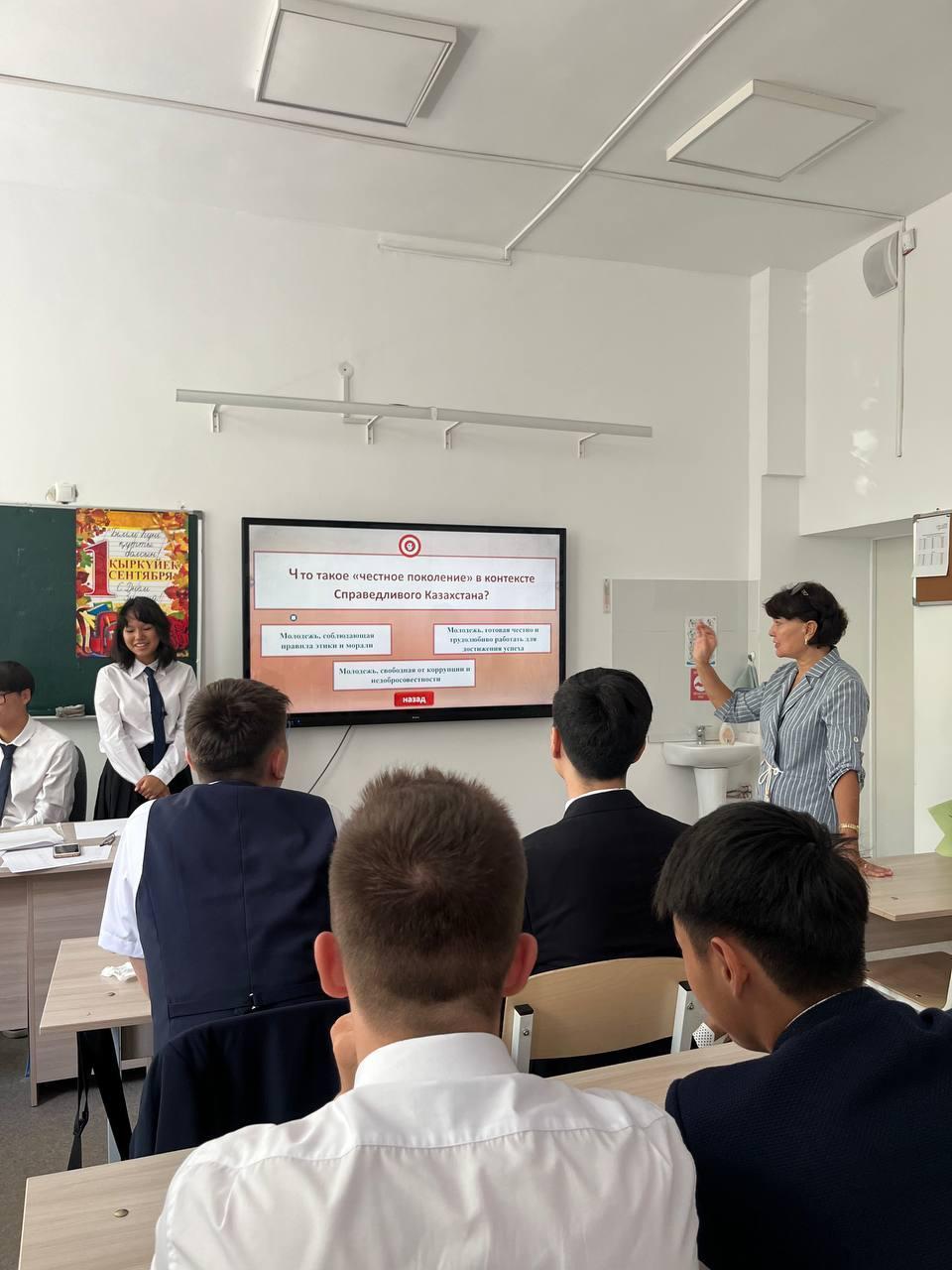 01 сентября 2023 года после торжественной линейки в КГУ "Лицей № 166" для учащихся 5 «А», 6 «Г», 8 «А», 8 «Б», 9 «А», 10 «Б» классов был проведён классный час на тему: "Справедливый Казахстан: качественное образование, честное поколение, успешная нация".