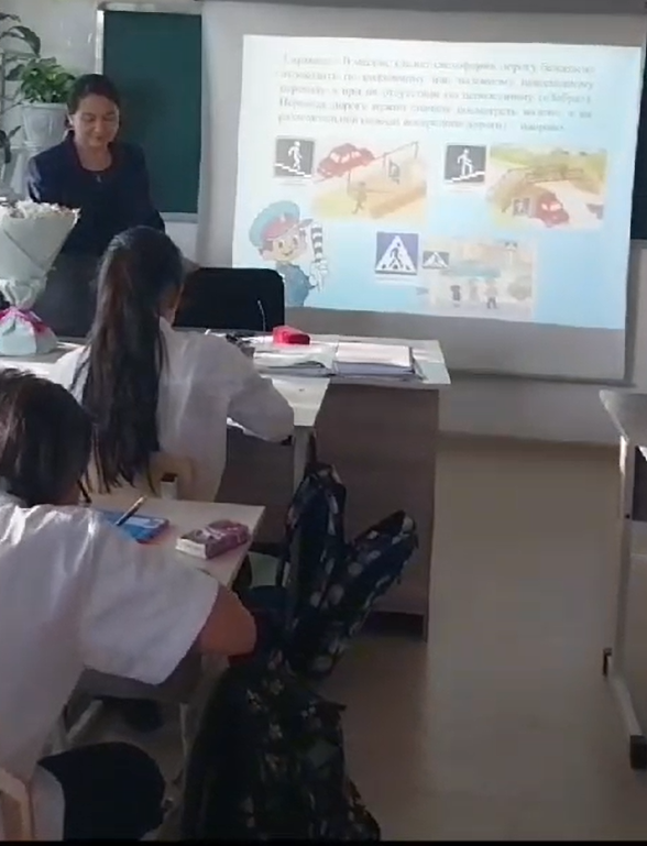 Сынып сағаты барысында оқушылар жұмбақтар, өлеңдер, макеттер, жадынамалар арқылы ЖҚЕ-мен танысты. Сабақ жолдағы қауіпсіз мінез-құлық туралы ақпаратқа толы болды. Оқушылар жол қозғалысы ережелерін бекітуге бағытталған сұрақтарға жауап берді.