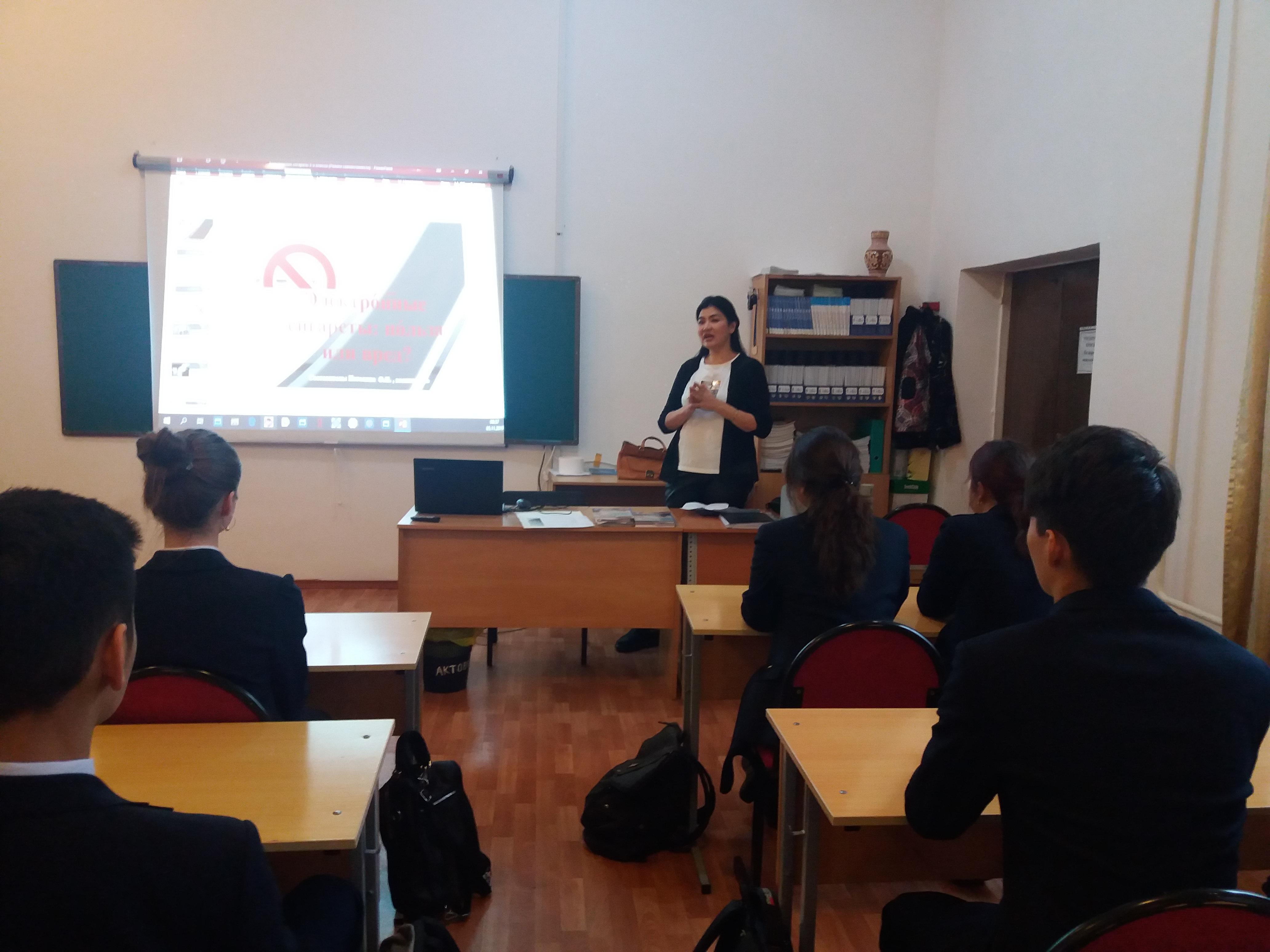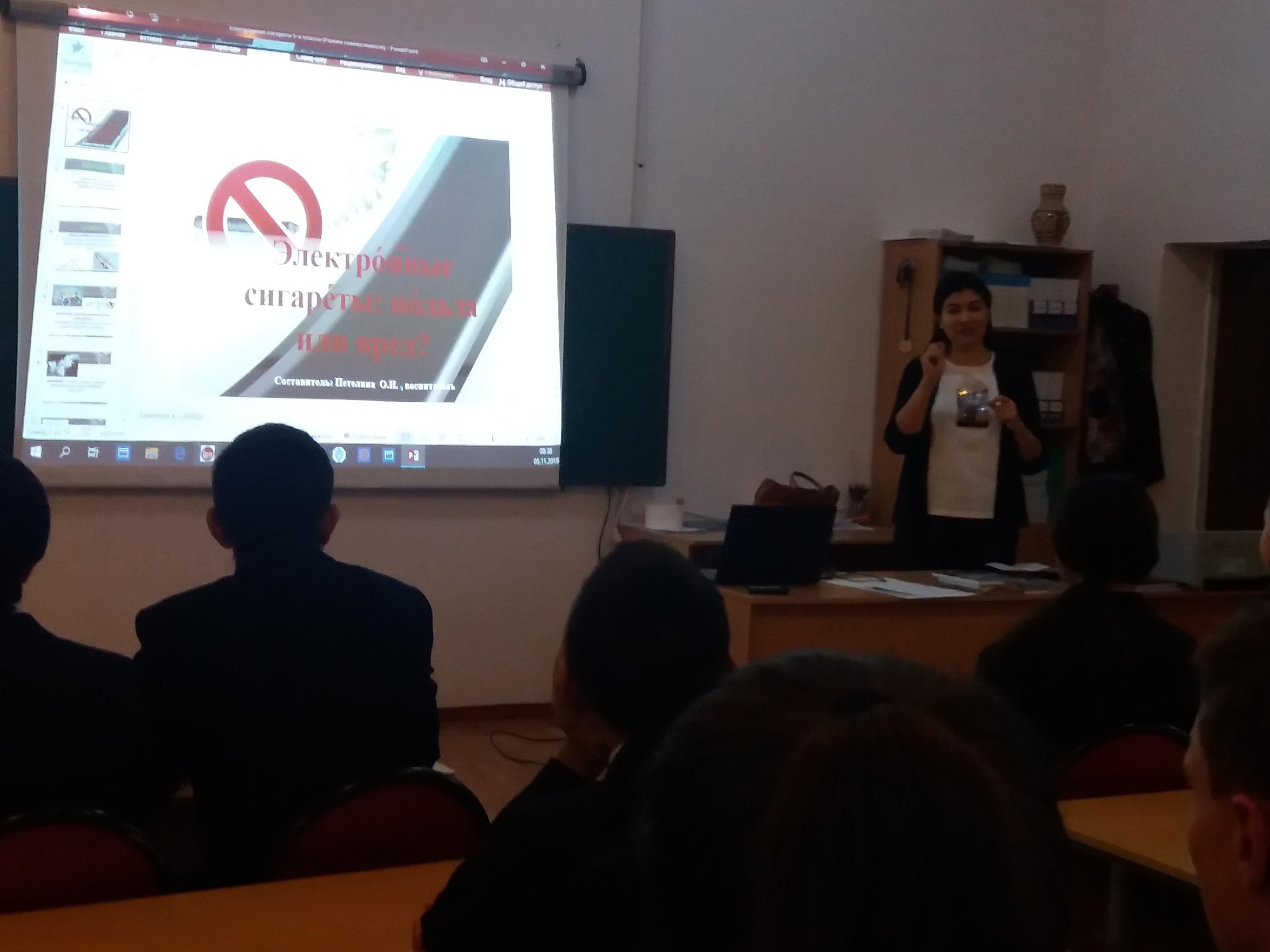 05 ноября 2019 года в КГУ «Лицей № 166» в 10-11 классах прошел классный час на тему «Электронные сигареты: вред и ответственность», на котором были освещены наболевшие темы о курение и об электронных сигаретах.