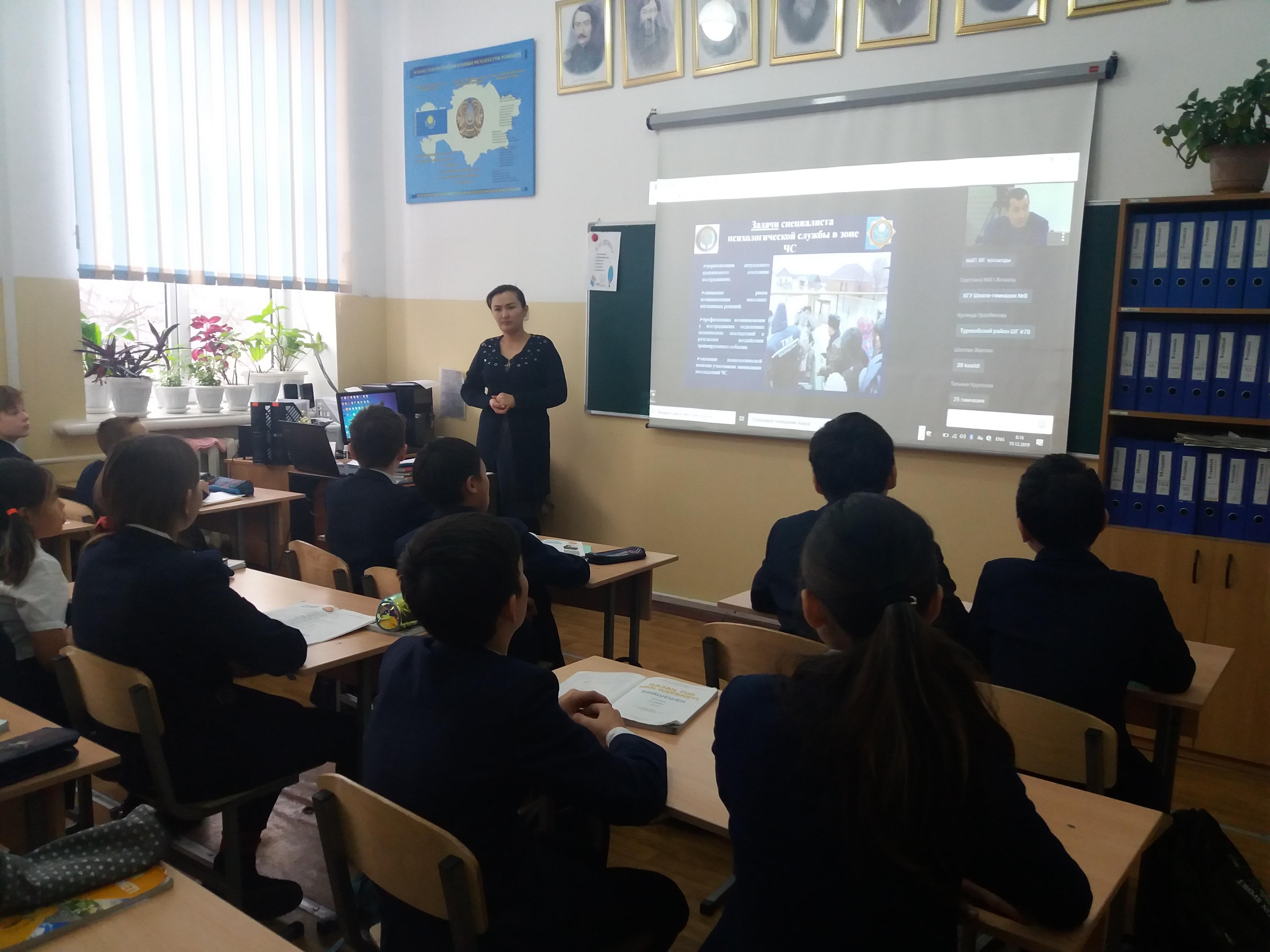 19 декабря 2019 года в КГУ «Лицей № 166» прошел интерактивный урок в on-line режиме на тему: «Психологическая помощь при чрезвычайных ситуациях» с участием сотрудников «ЦМК» КЧС МВД РК г. Алматы. Присутствовало 78 учеников.