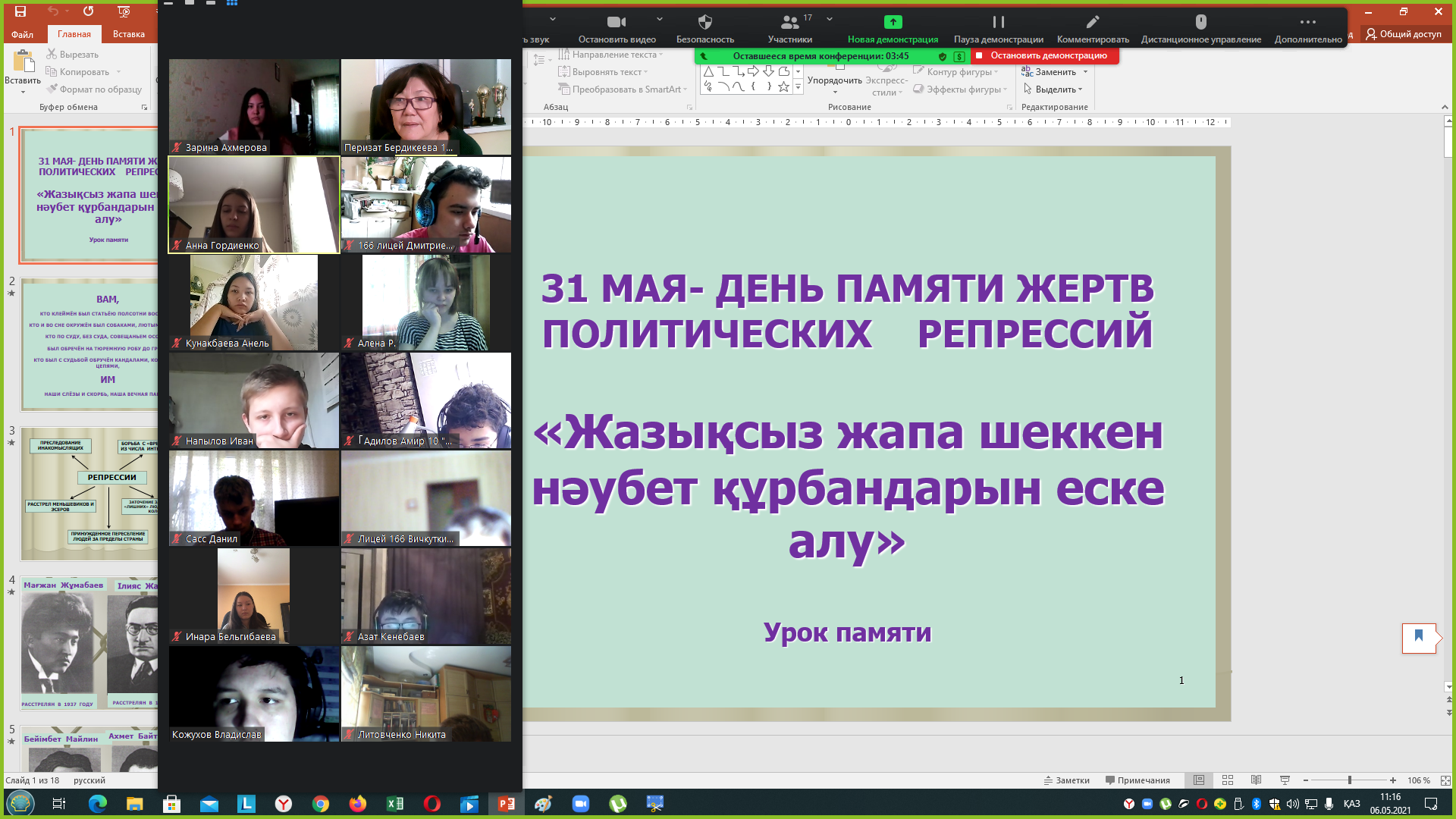 18 мая 2021 года в КГУ «Лицей № 166» в честь 30-летия Независимости Республики Казахстан был организован урок памяти жертв политических репрессий и голода с участием учеников 10 «А» класса. В ходе занятия было разъяснено, что после обретения Независимости 14 апреля 1993 года был принят Закон Республики Казахстан «О реабилитации жертв массовых репрессий» и 31 мая объявлен Днем памяти жертв политических репрессий и голода.