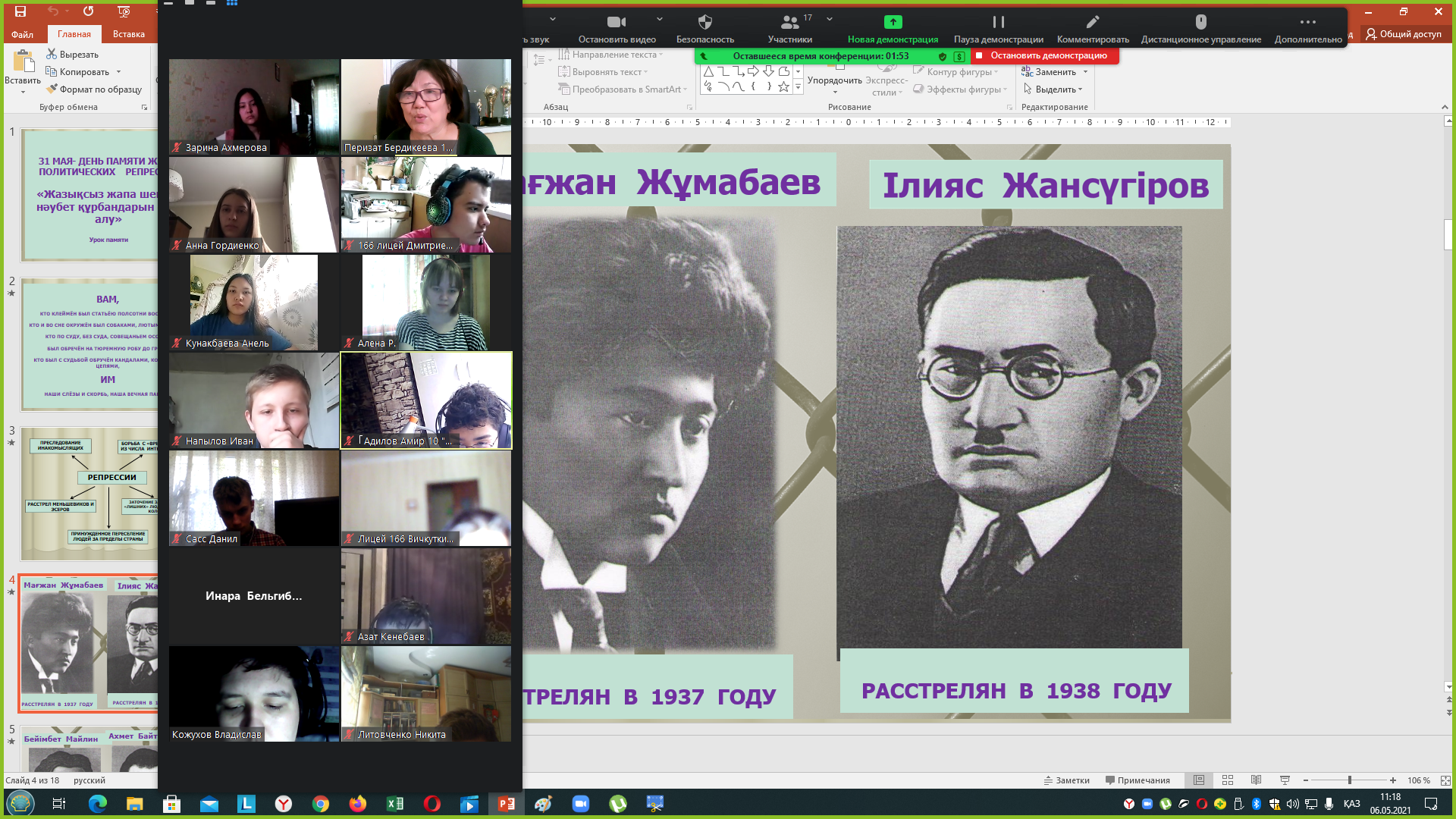 На уроке было разъяснено о биографиях репрессированных людей, внесших существенный вклад в развитие страны, о системе лагерей АЛЖИР, важности сохранения памяти о них, о культуре исторической памяти и коллективной памяти о тех трагических событиях.