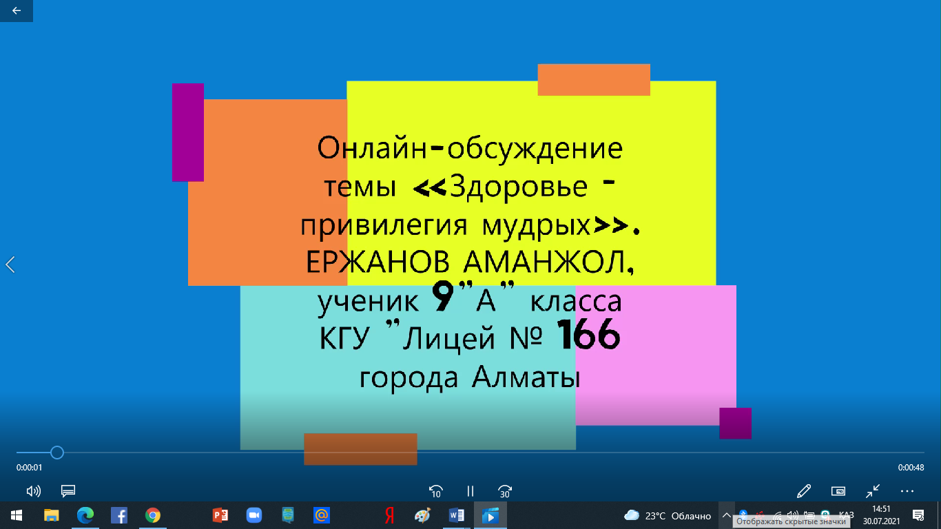 Ученики 9 «А» класса КГУ «Лицей № 166» приняли активное участие в онлайн-обсуждение темы «Здоровье – привилегия мудрых». Здоровье – самое важное в жизни, с самого детства нужно знать его компоненты и вырабатывать ответственное отношение к нему. Ученики попытались выяснить, связаны ли между собой такие понятия, как мудрость и здоровье. Что такое мудрость? А это «глубокий ум, опирающийся на жизненный опыт». В результате пришли к выводу, что здоровым быть необходимо и модно.