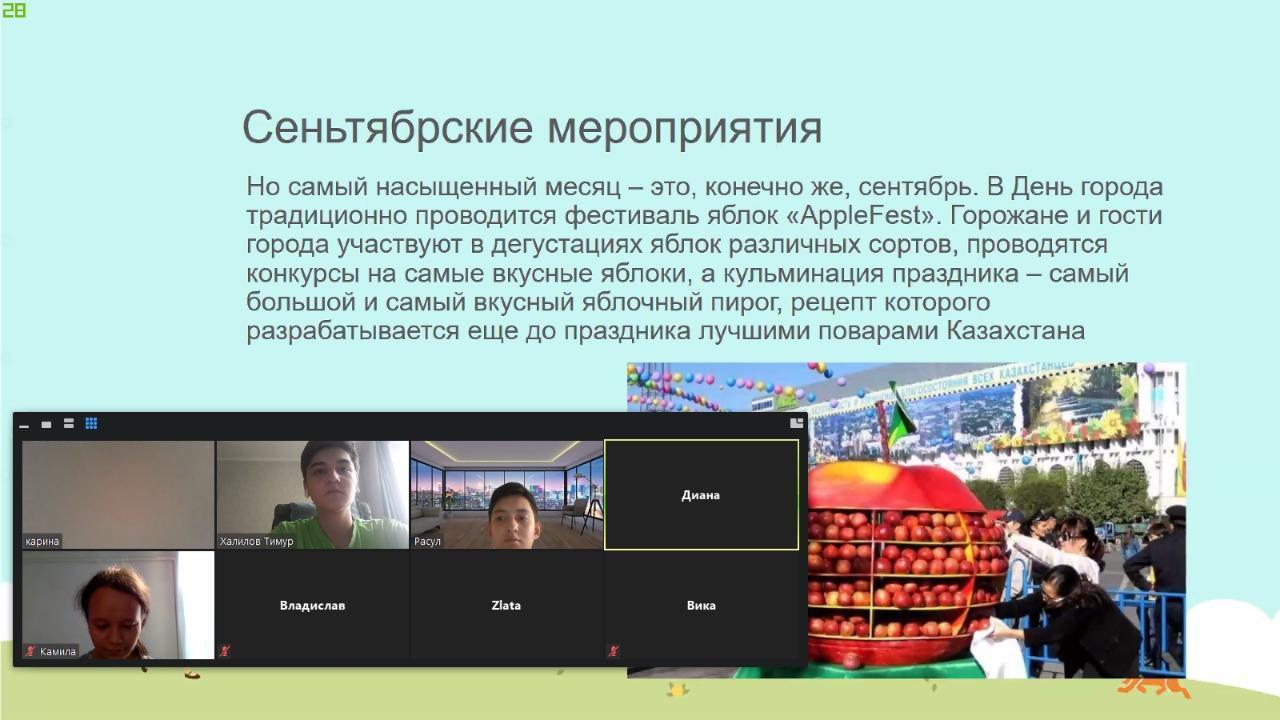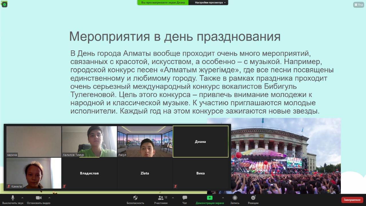 15 сентября 2021 года в режиме онлайн классный руководитель 10 «Б» классе КГУ «Лицей № 166» Бермухамбетова Р.С. провела информационный час на тему «Мероприятия в день празднования», посвященный ко Дню города Алматы. Цель: привить учащимся чувство патриотизма и гордости к родному городу.