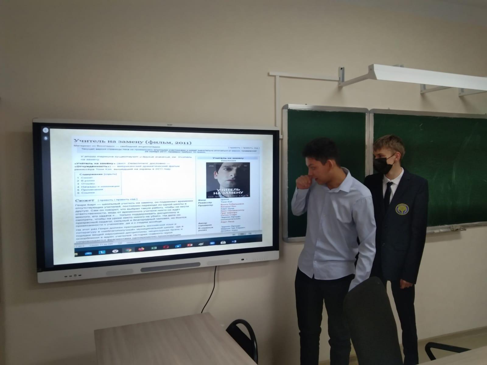 Обсуждение в классе началось с краткого пересказал фильма от учеников. Трое полностью и в подробностях рассказали весь сюжет фильма, затрагивая все темы и проблемы. Остальные же учащиеся проявили большой интерес, и в нужное время дополняли спикеров.
