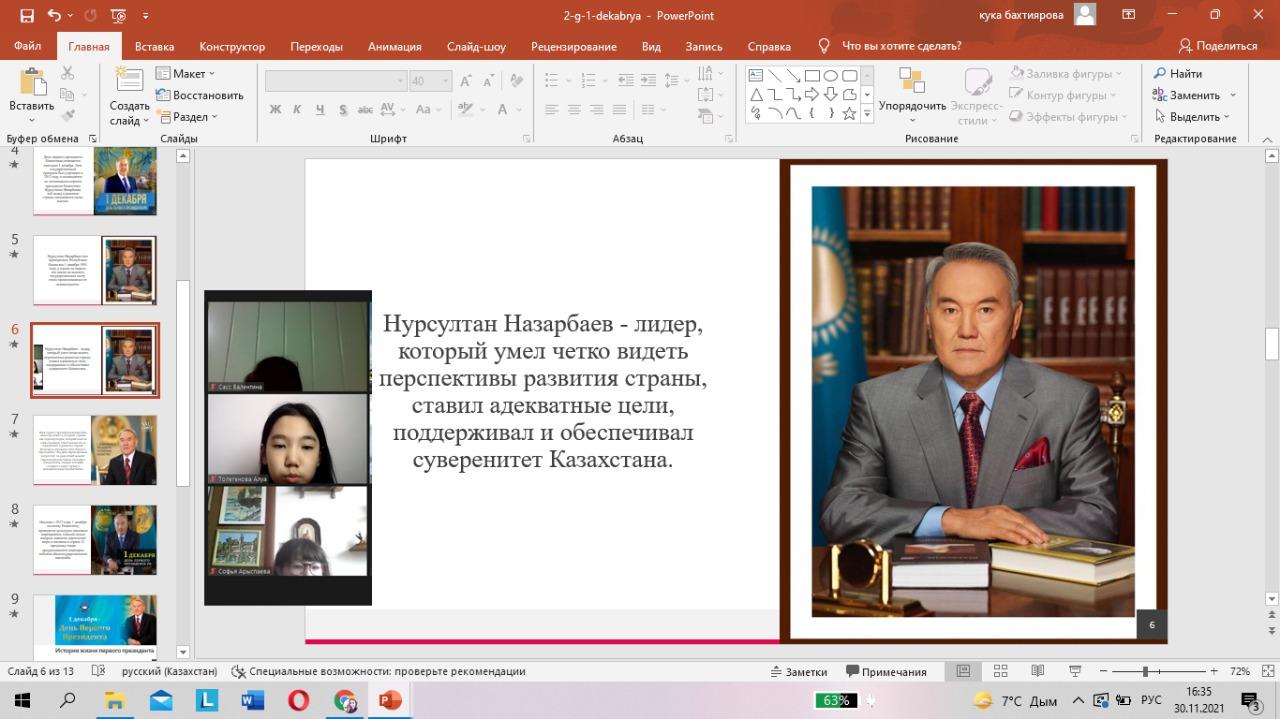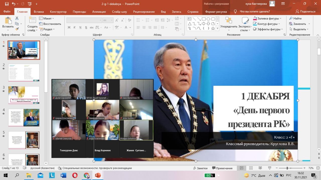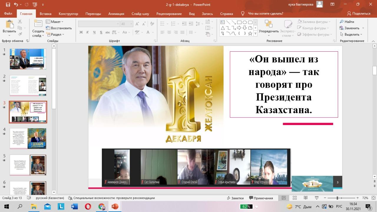 Классный час завершился слушанием и исполнением гимна Казахстана, и пожеланиями друг другу в честь праздника 1 декабря – День Первого Президента РК.