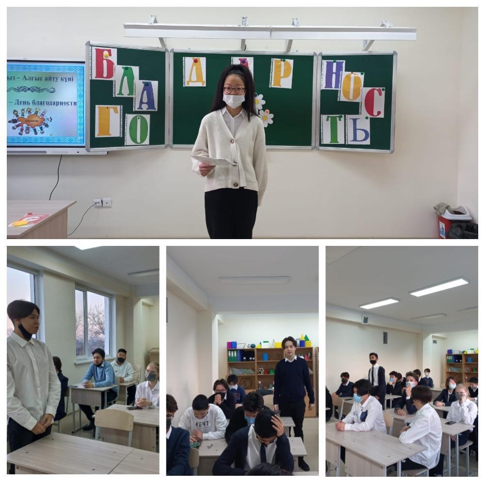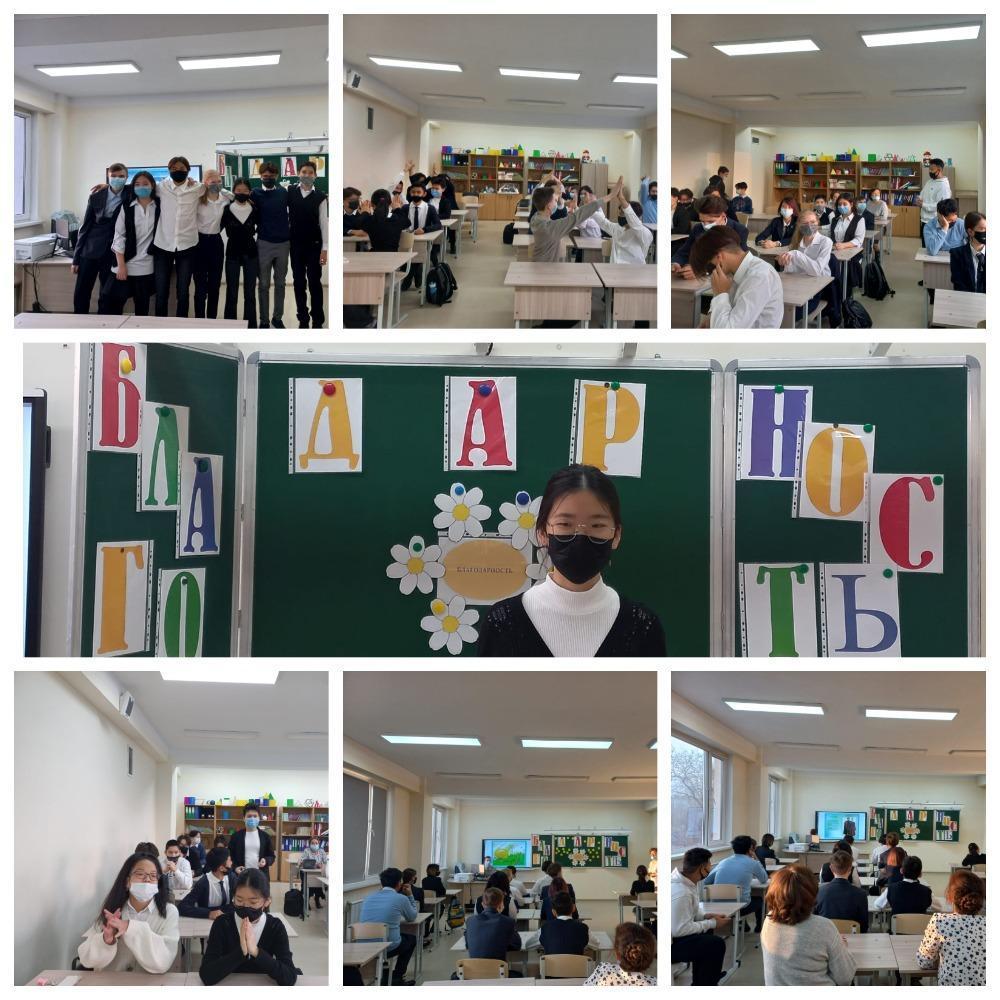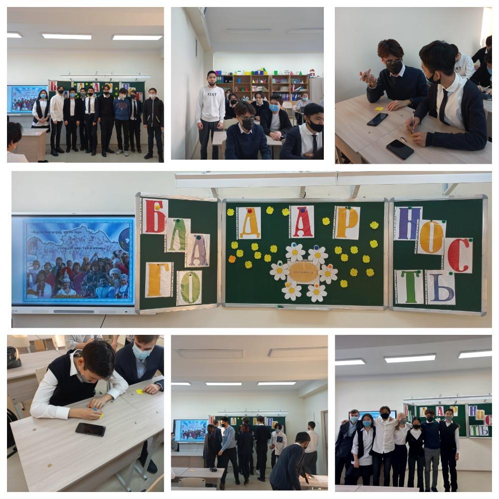 Ведущая Хон Даша начала мероприятие с разминки «Хорошо!», помогающий позитивно относиться к миру, людям, Все ученики приняли участие в подготовке и проведении мероприятия: подготовка презентации, чтение стихов, поиск материалов по истории корейцев, немцев, поляков, греков, народов Кавказа, для которых Казахстан стал второй родиной. Свое эмоциональное состояние дети отразили в созданном ими видеоролике «Я благодарю».