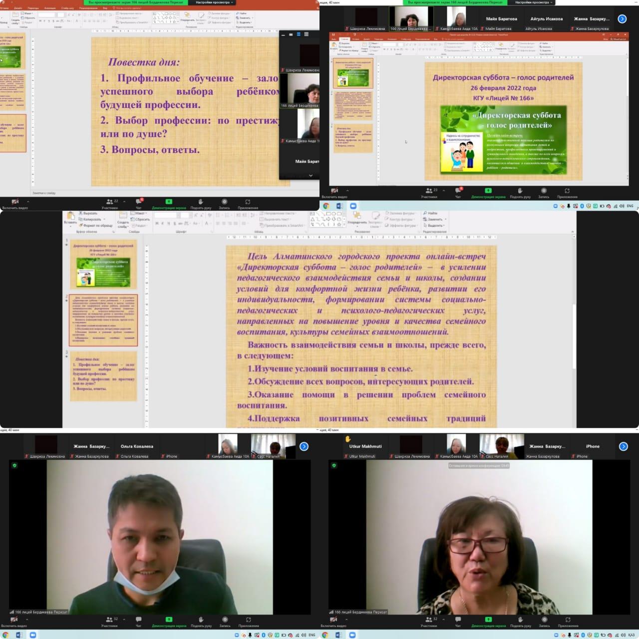 26 февраля 2022 года состоялась общешкольное родительское собрание «Директорская суббота – голос родителей» на платформе ZOOM. Были приглашены родителей учащихся 10-11-классов КГУ «Лицей № 166».