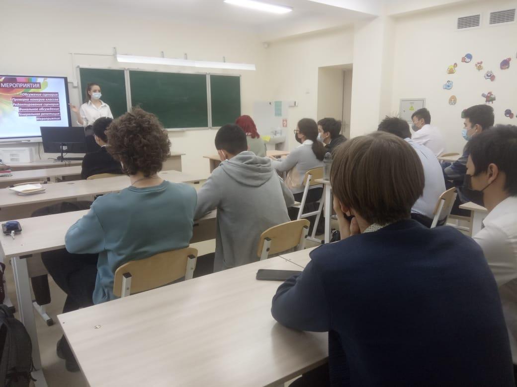 На классном часе ученики обсудили развлекательную программу концерта и недочеты сценария. Решили, как будут проходить репетиции. Так же был решен вопрос об украшении помещения.