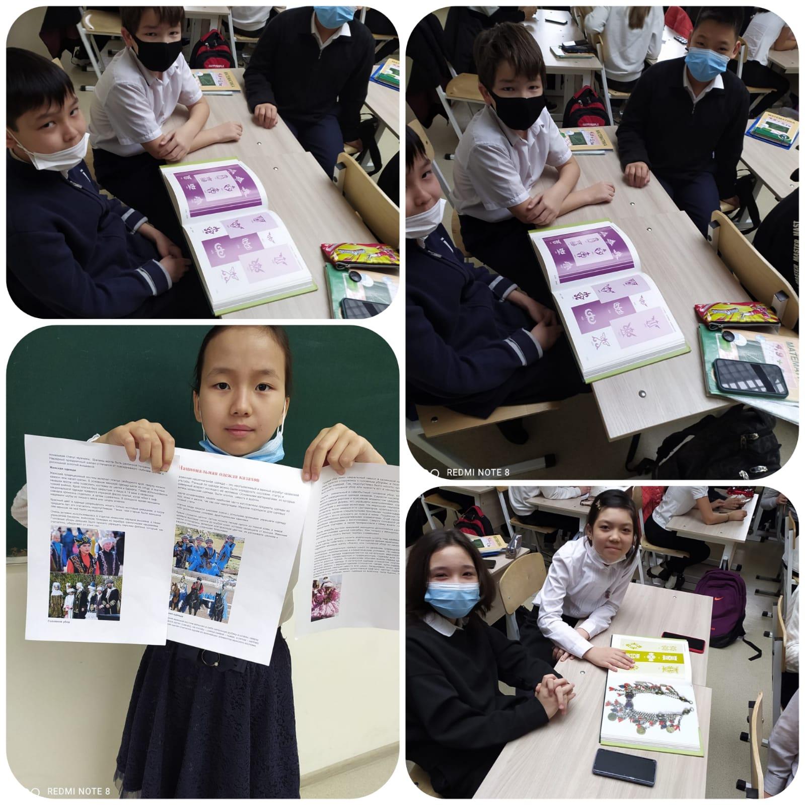 В 5 «Б» классе КГУ «Лицей № 166» в преддверии весеннего праздника «Наурыз» прошел классный час на тему «Национальная одежда». Дузеева Айдана подготовила замечательный доклад о традициях создания, использования определенных материалов , цветов в одежде казахского народа. Ребята познакомились особенностями возникновения и развития языка казахского орнамента.
