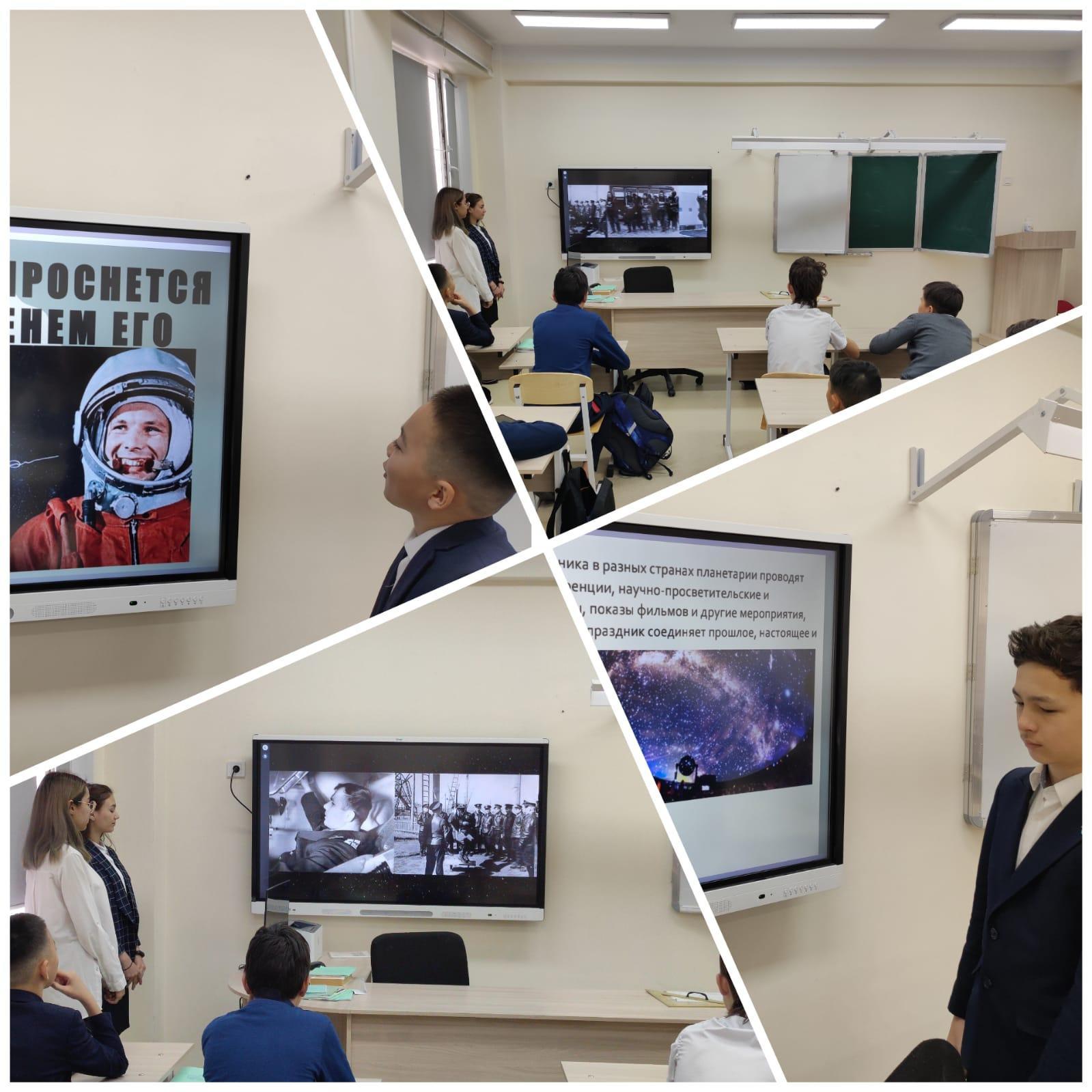 В 6-х классах КГУ «Лицей № 166» прошел познавательный час «Земля проснется с именем его», посвященный Юрию Гагарину. Цель: познакомить учащихся с Ю.А.Гагариным – первым человеком, проложившим дорогу в космос. Ученики расширили свои знания про космонавтов благодаря сегодняшнему уроку.