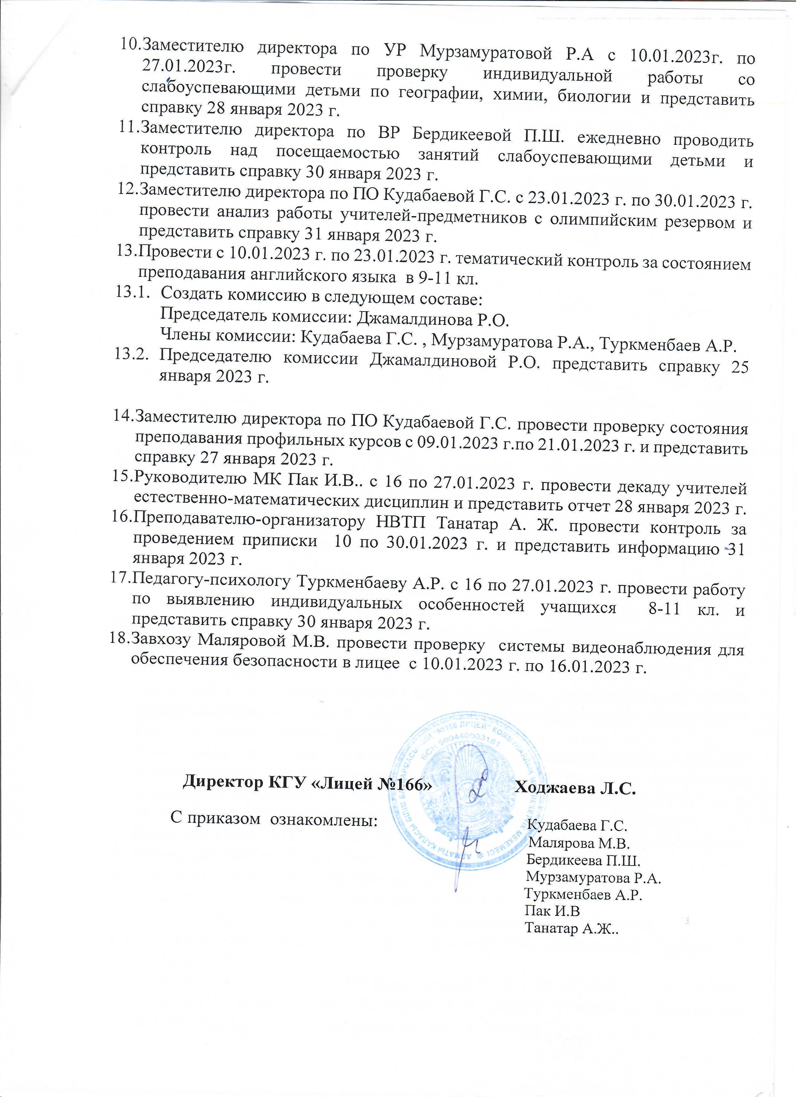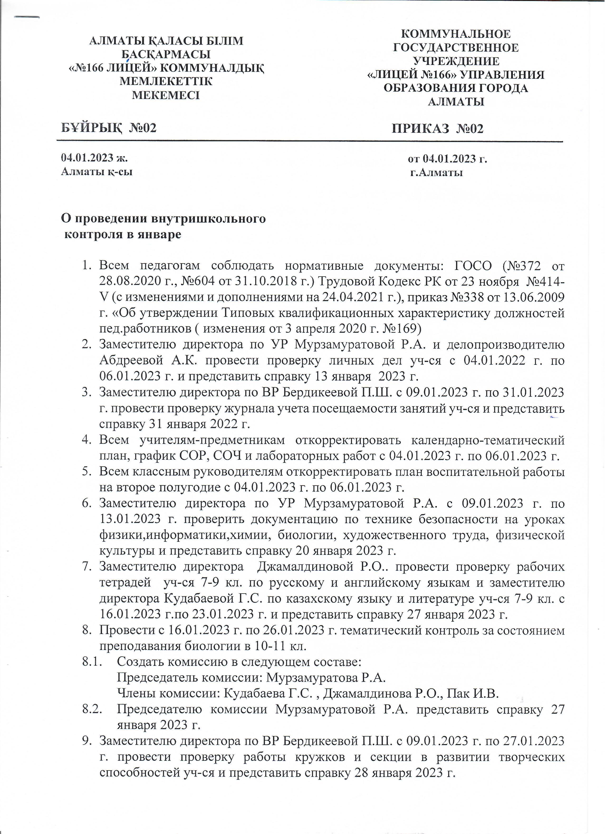 04 январь 2023 0 1 2 3 4 5 Қаңтар айында мектепішілік бақылау жүргізу туралы бұйрық Қаңтар айында мектепішілік бақылау жүргізу туралы бұйрықПриказ О проведении внутришкольного контроля в январе Осы беттің QR-коды:QR-код этой страницы: