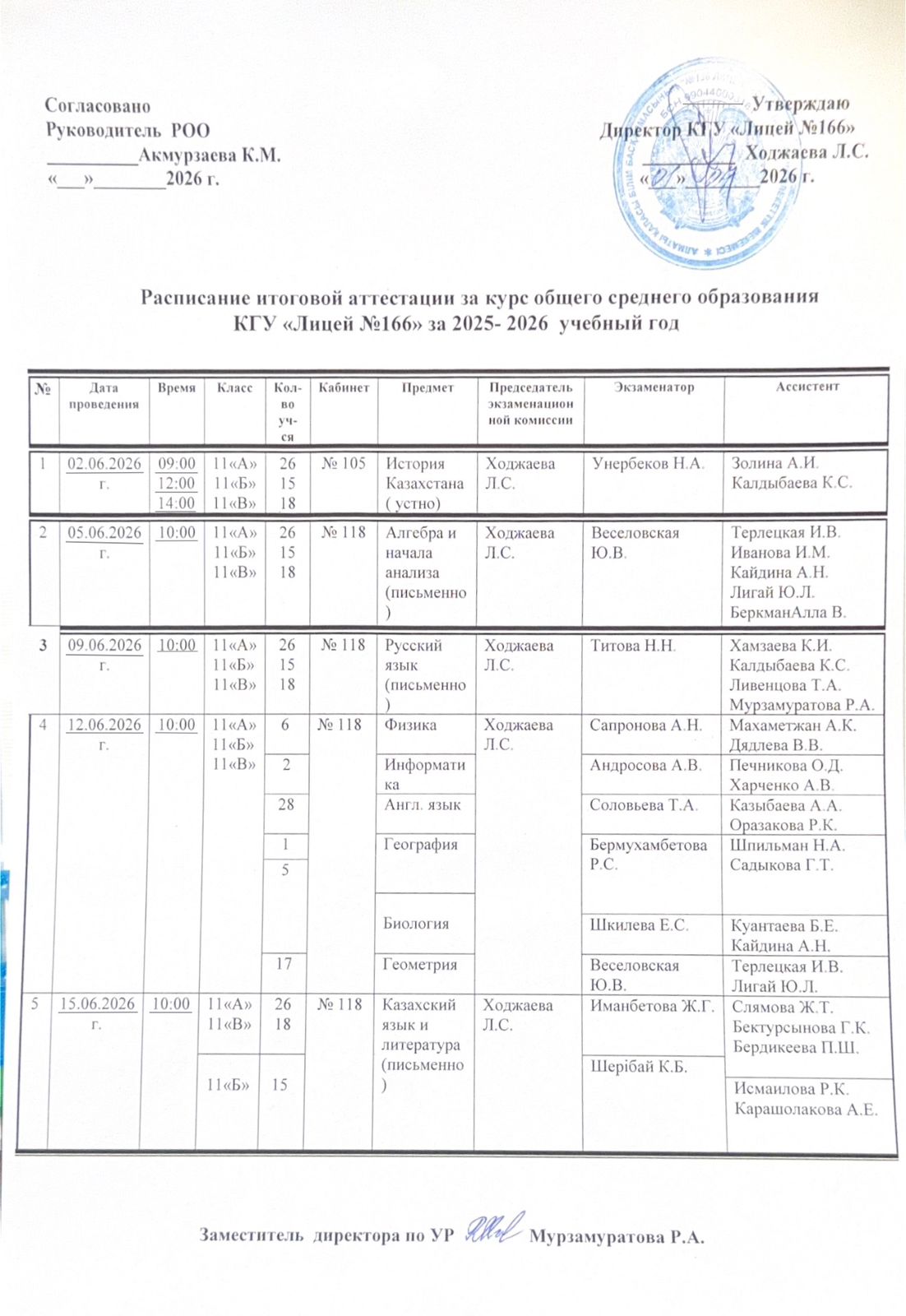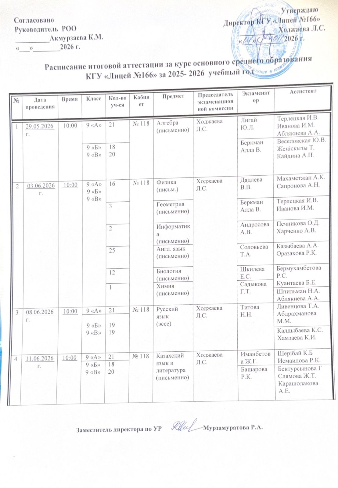 01 апрель 2026 0 1 2 3 4 5 Расписание итоговой аттестации за курс основного средного образования КГУ "Лицей №166" за 2025-2026 учебный год Осы беттің QR-коды:QR-код этой страницы: