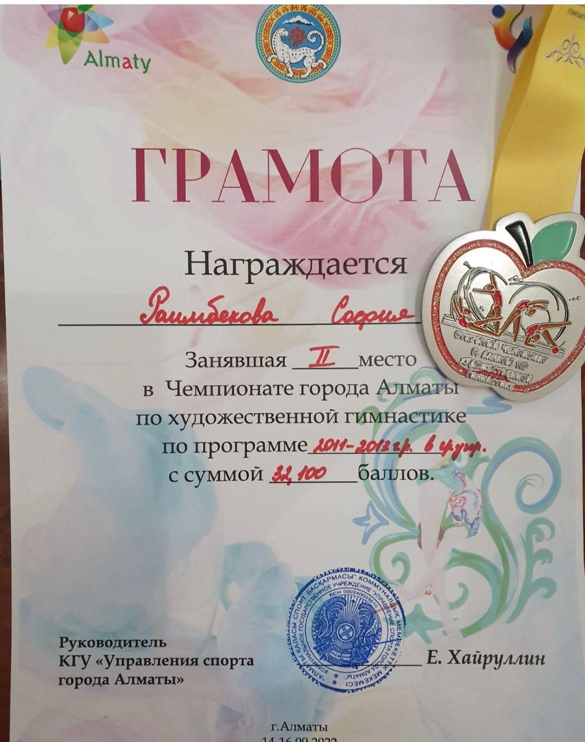 18 октябрь 2022 0 1 2 3 4 5 Құттықтаймыз!-Поздравляем! Поздравляем!Ученица 6 «Б» класса КГУ «Лицей №166» Раимбекова София заняла ІІ место в Чемпионате города Алматы по художественной гимнастике по программе 2011-2013 г.р., с суммой 32,100 баллов. Осы беттің QR-коды:QR-код этой страницы: