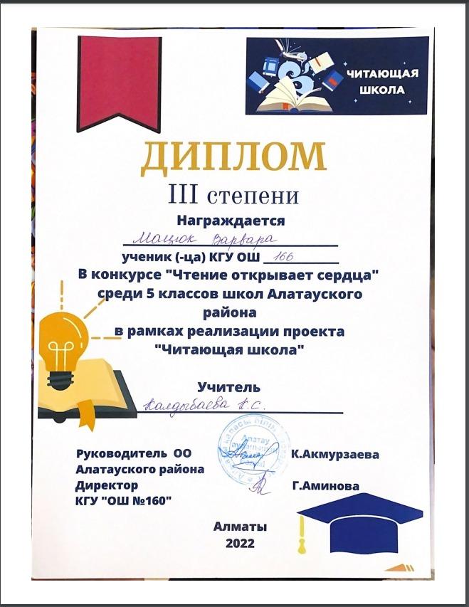 Мацюк Варвара, ученица 5 «Е» класса КГУ “Лицей № 166”, заняла ІІІ место в конкурсе «Чтение открывает сердце» среди учащихся 5-х классов Алатауского района в рамках реализации проекта «Читающая школа» С победой, Варвара! Пусть в будущем будет много таких побед!