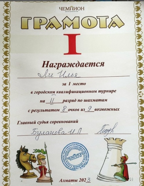 Ученик 5 «Г» класса КГУ «Лицей № 166» Ли Илья занял призовое І место в городском квалификационном турнире на ІІ разряд по шахматам с результатом 8 очков из 9 возможных. Поздравляем Илью с успешным получением разрядов!