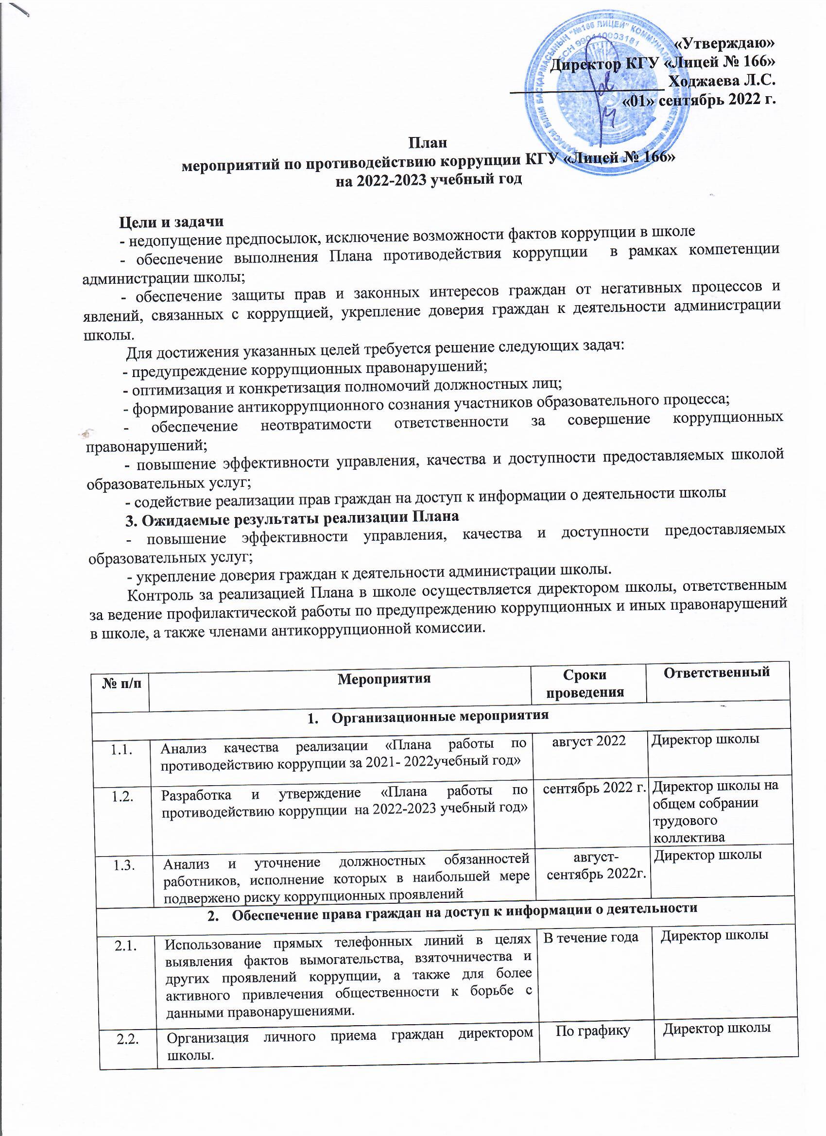 01 сентябрь 2022 0 1 2 3 4 5 План мероприятий по противодействию коррупции КГУ "Лицей № 166" на 2022-2023 уч год уч План мероприятий по противодействию коррупции КГУ "Лицей № 166" на 2022-2023 уч год у Осы беттің QR-коды:QR-код этой страницы: