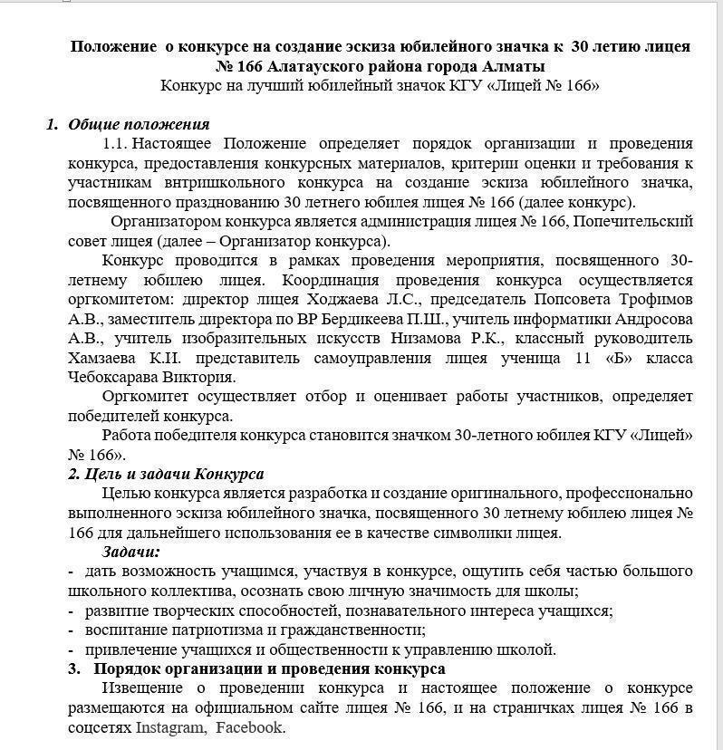 10 июнь 2022 0 1 2 3 4 5 Положение о конкурсе на создание эскиза юбилейного значка к 30 летию лицея № 166 Осы беттің QR-коды:QR-код этой страницы: