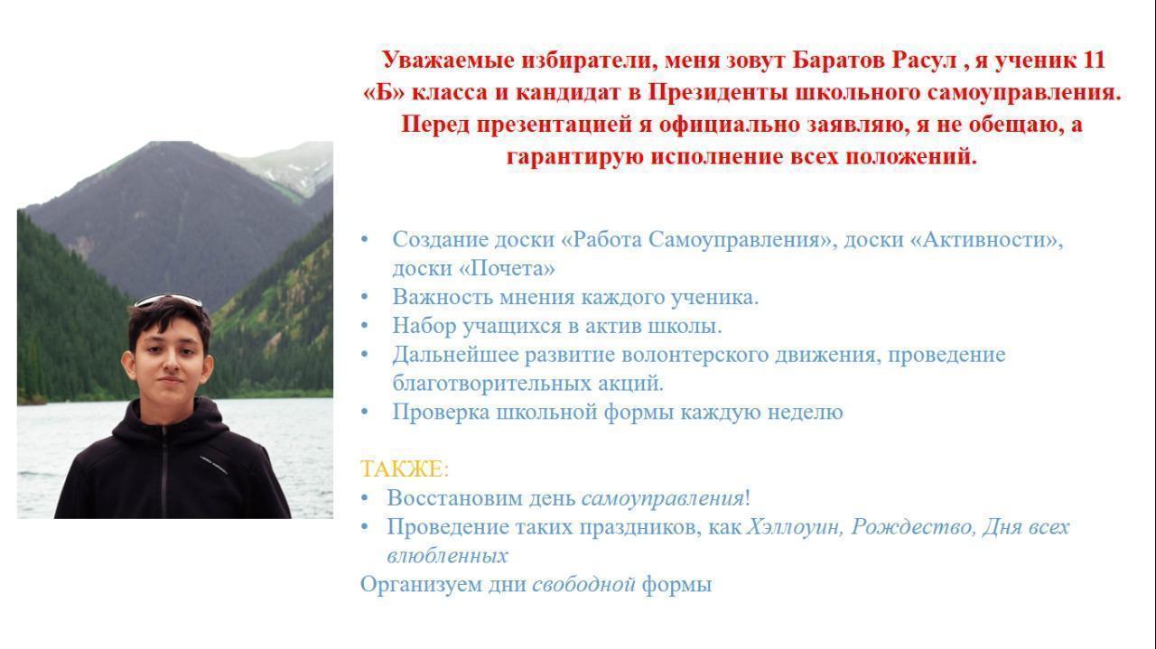20 сентябрь 2022 0 1 2 3 4 5 Баратов Расул. Ученик 11 «Б» класса и кандидат в Президенты школьного самоуправления Осы беттің QR-коды:QR-код этой страницы: