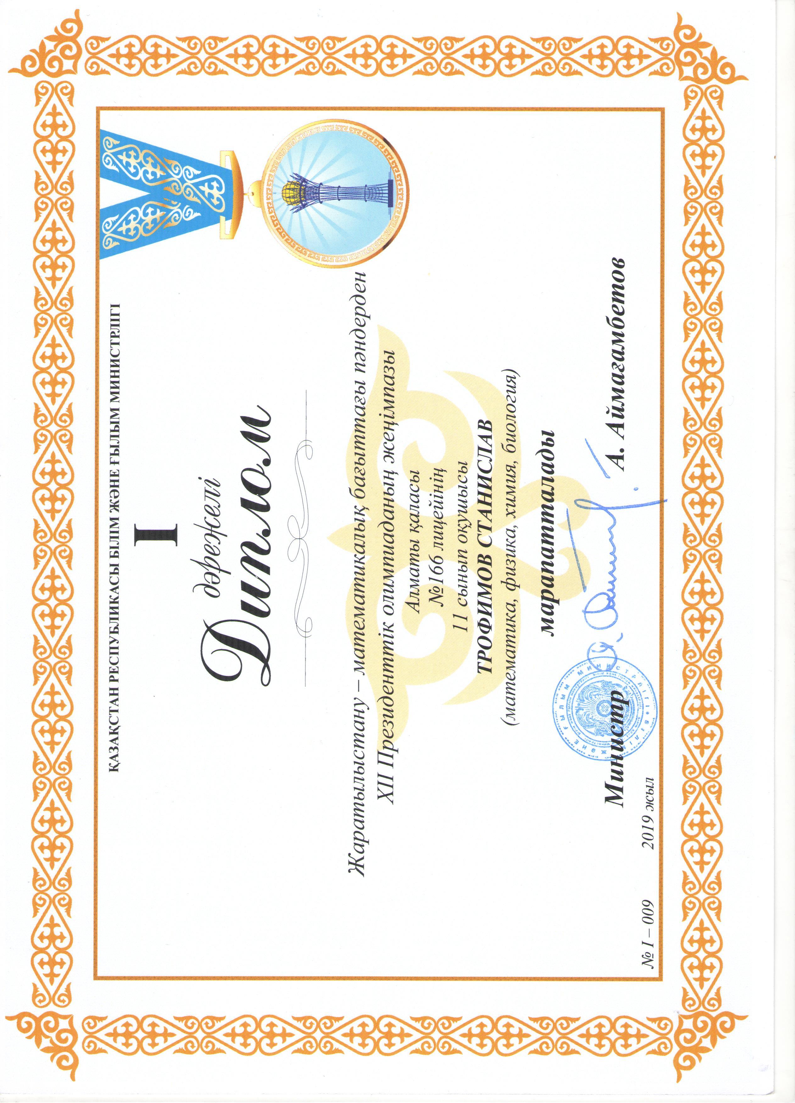 В ХІІ Республиканской Президентской олимпиаде среди учащихся 11 классов Трофимов Станислав занял I место, а Назыров Эмиль и Угай Артур - II места. Республиканский заключительный тур состоялся 15 ноября в г. Темиртау.