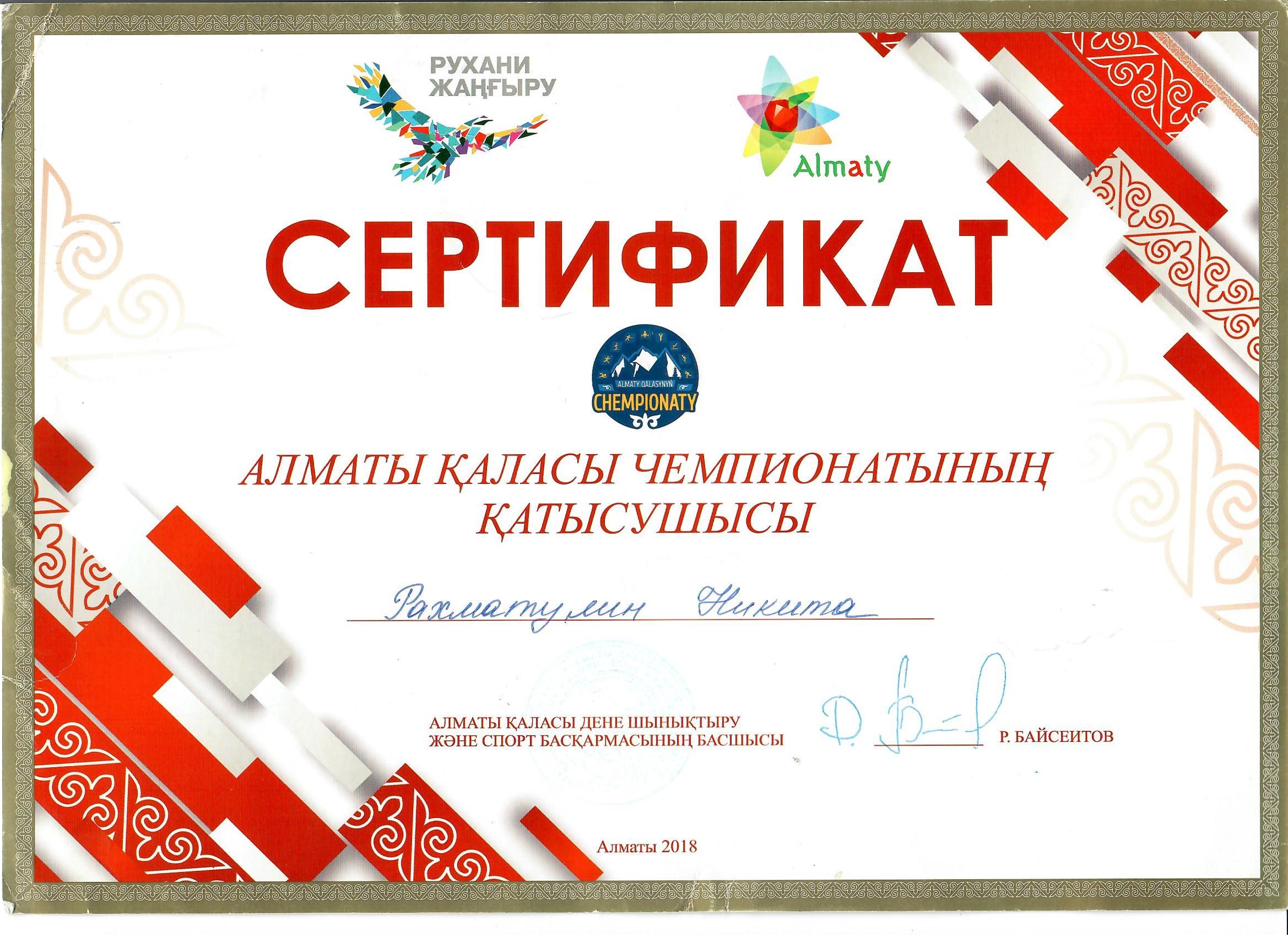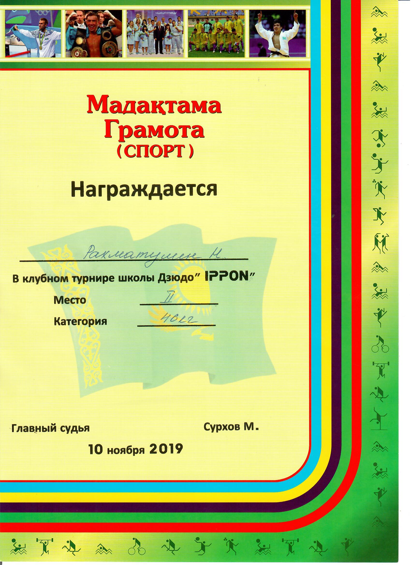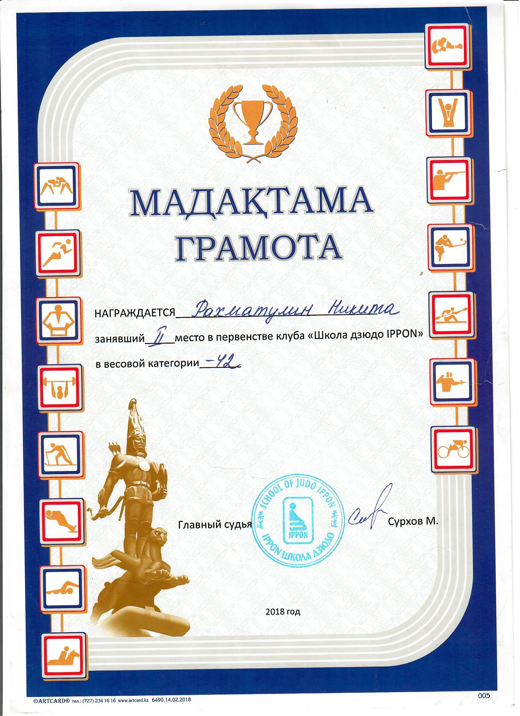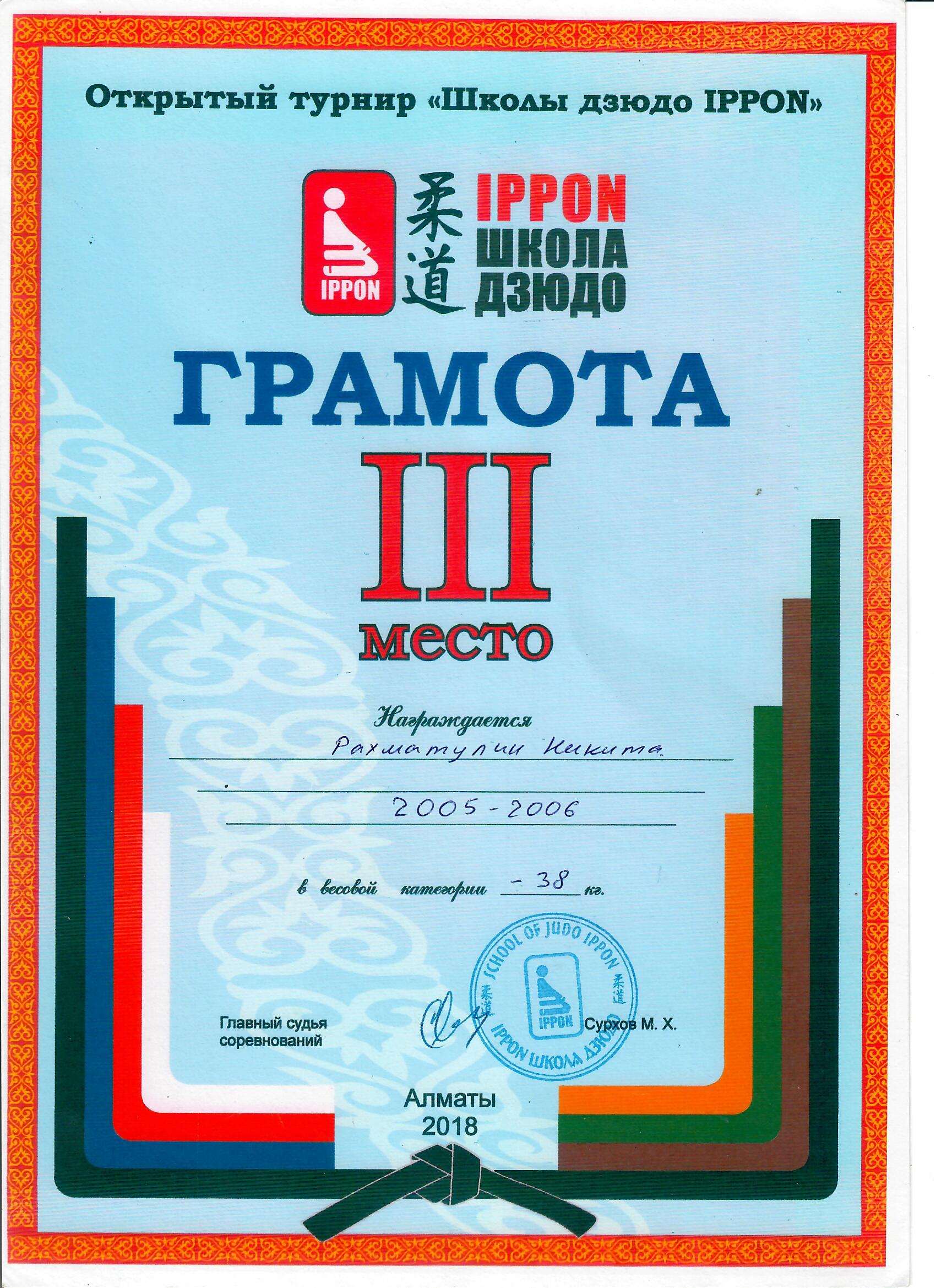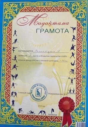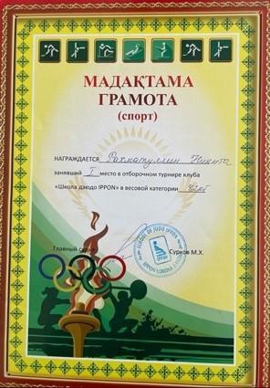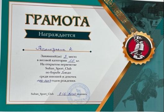 Рахматулин Никита, ученик 8Б класса КГУ "Лицей № 166" занимается пятый год в Школе дзюдо "Ippon". Никита – победитель и призер многих районных, городских и областных соревнований. Никита ловкий, сильный духом, техничный и целеустремленный спортсмен. На данный момент имеет 3й-КЮ (зелёный пояс). Цель Никиты - достичь 1й-КЮ (черный пояс).