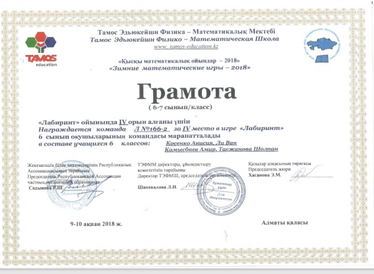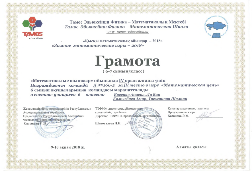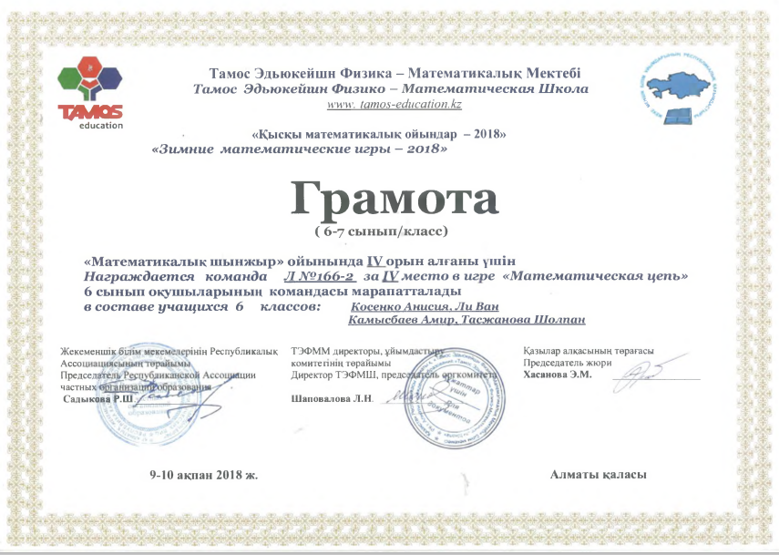 2. Зимние математические игры, грамота, 4 место (2018 г.)