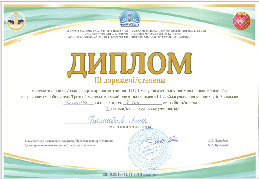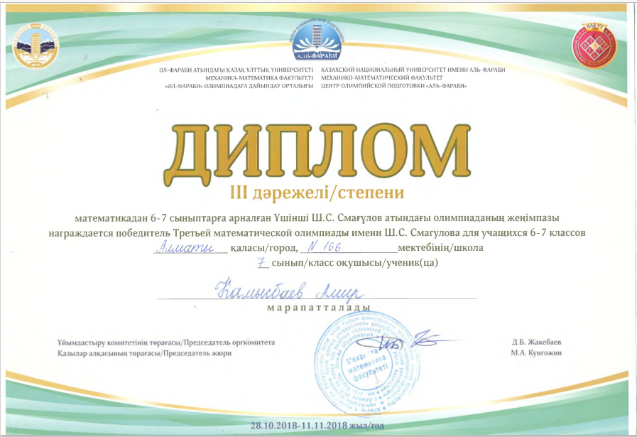 16. Жаутыковская олимпиада, диплом 3 степени (2019г.)