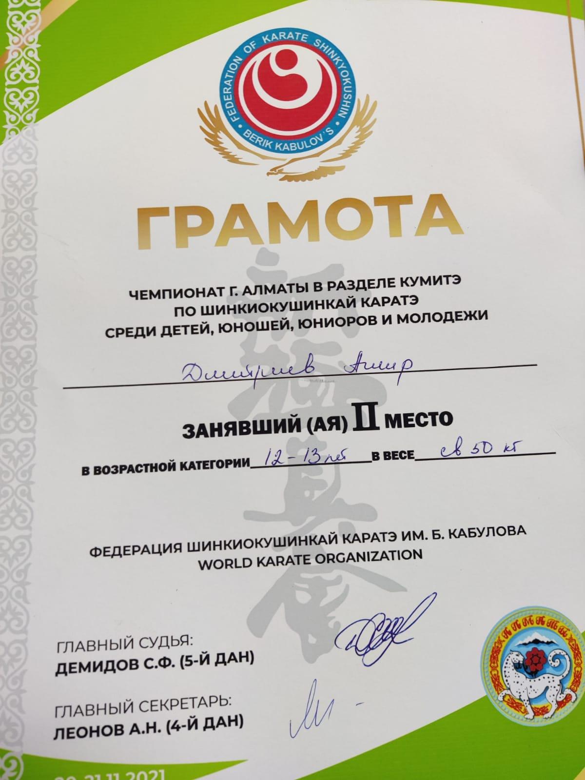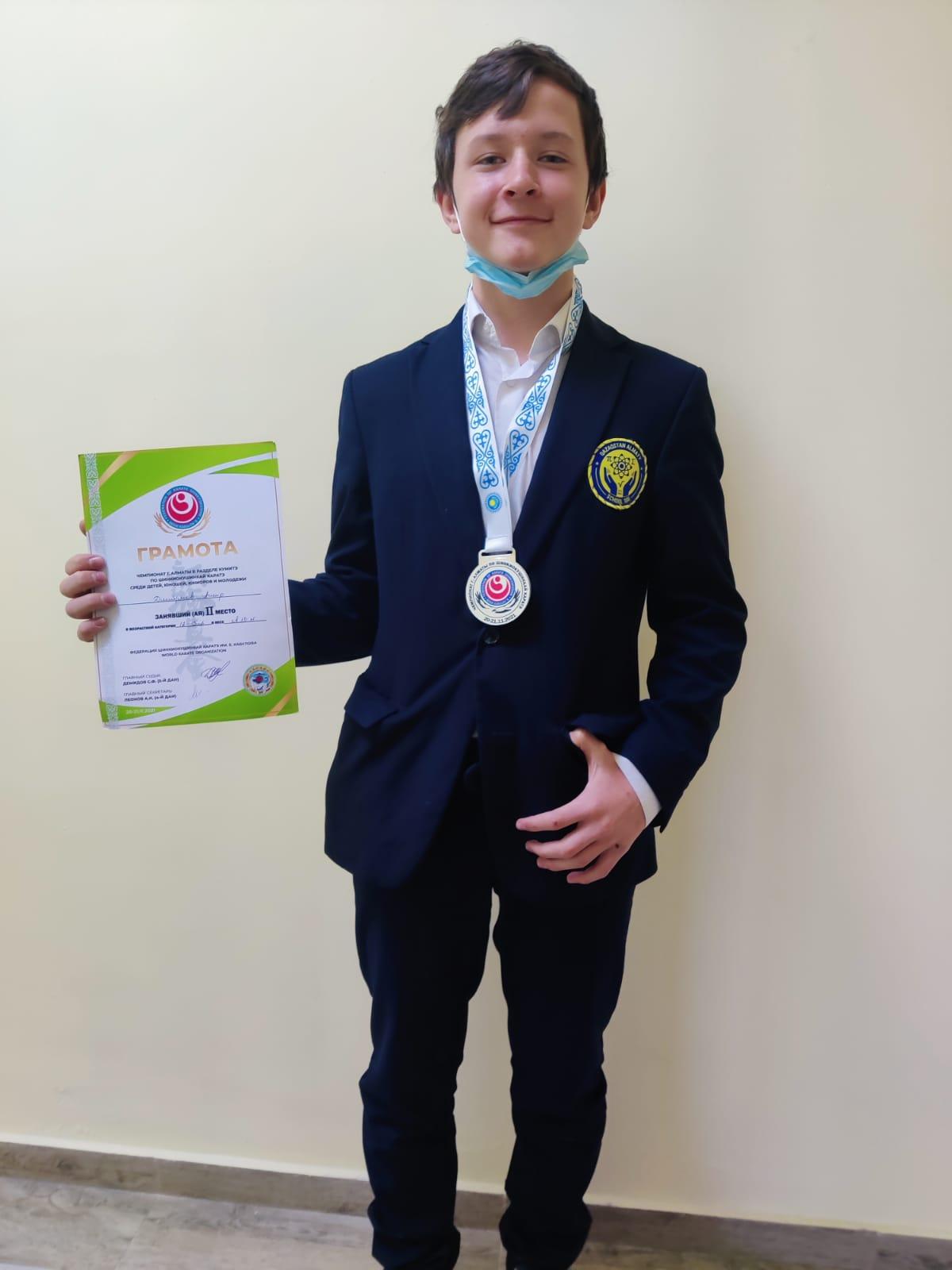 Ученик 7 «В» класса КГУ «Лицей № 166» Дмитриев Амир занял ІІ место и был награжден Грамотой в возрастной категории 12-13 лет в весе свыше 50 кг в Чемпионате г. Алматы в разделе Кумитэ по шинкиокушинкай каратэ среди детей, юношей, юниоров и молодежи.