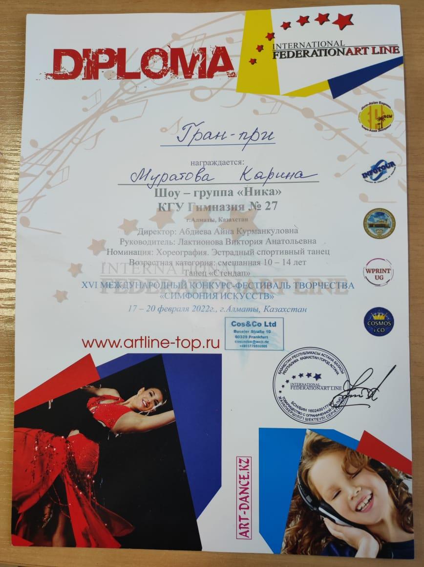 17-20 февраля 2022 года ученица 7 «А» класса КГУ «Лицей № 166» Муратова Карина в составе шоу-группы «Ника» участвовала в XVI Международном Конкурс-фестивале творчества «СИМФОНИЯ ИСКУССТВ» с танцем «Стендап», и по номинации «Хореография. Эстрадный спортивный танец» шоу-группа «Ника» заняла Гран-при.
