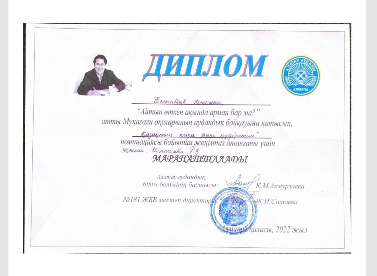 Ақиық ақын Мұқағали Мақатаевтың шығармашылығын насихаттау, жастардың бойында поэзия әлеміне деген сүйіспеншілікті ояту мақсатында Алматы қаласының, Алатау ауданында орналасқан № 181 мектептің ұйымдастыруымен «Мұқағали оқулары» байқауының аудандық деңгейі өтті. «Айтып өткен ақында арман бар ма?» номинациясы бойынша «№ 166 лицей» КММ-сінің 8 «Б» сынып оқушысы Бельгибаев Бекежан қатысып, дипломмен марапатталды!