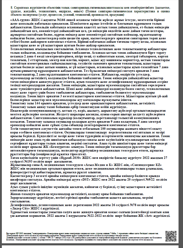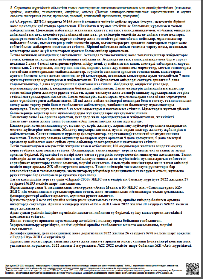 01 сентябрь 2022 0 1 2 3 4 5 Санитариялық-эпиде миологиялық қорытынды Санитарно-эпидемиологическое заключе ние № А.01.H.KZ33VWF00064942 Дата: 04.05.2022 ж. (г.) Санитариялық-эпиде миологиялық қорытындыСанитарно-эпидемиологическое заключе ние№ А.01.H.KZ33VWF00064942Дата: 04.05.2022 ж. (г.) Осы беттің QR-коды:QR-код этой страницы: