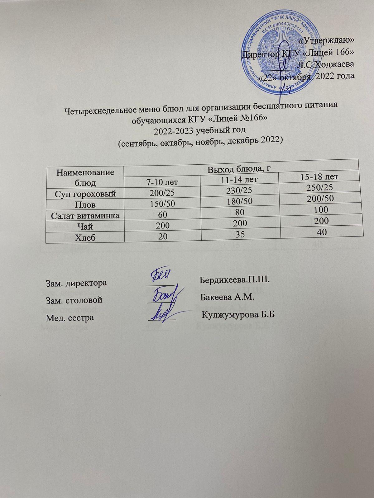 Четырехнедельное меню блюд для организации бесплатного питания обучающихся КГУ "Лицей №166" 2022-2023 учебный год