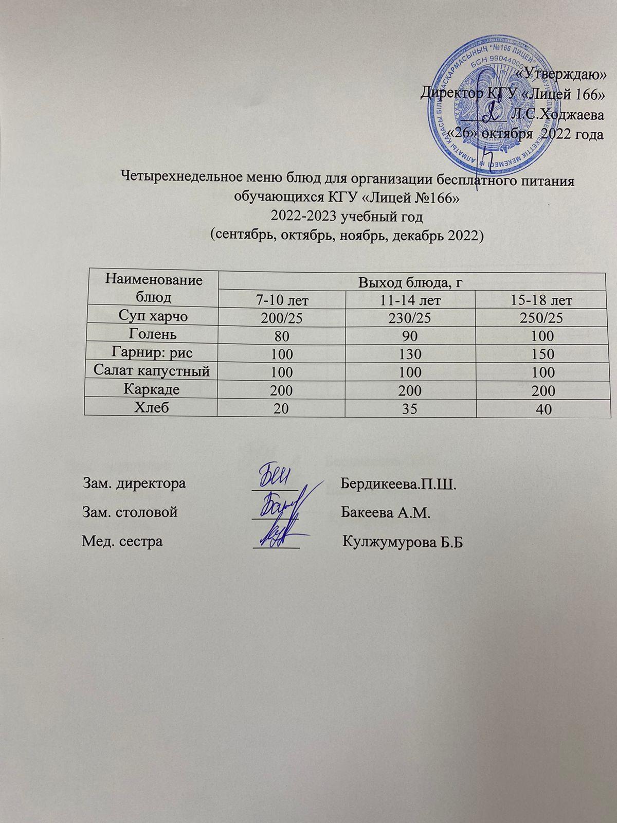 Четырехнедельное меню блюд для организации бесплатного питания обучающихся КГУ "Лицей №166" 2022-2023 учебный год 26 октября 2022 г